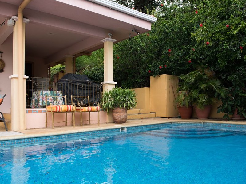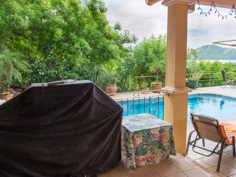 Located in the desirable area of North Playas Del Coco a full service beach community. Only 30 minutes to the International Airport, Province of Guanacaste, northwest Pacific. The villa is located directly across from a walking path beach access 100 meters. There are ocean views from every room and you can hear the waves. The villa offers: 2 bedrooms, 2.5 baths, high ceilings, beautifully furnished, private large pool, large covered terrace (with extra tables to seat up to 12 people for outdoor dining), deck off the pool and shaded areas, barbeque, exercise bike, close to many services yet very private and tranquil setting.
