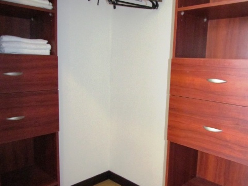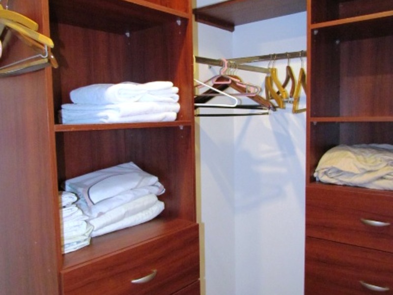 ● Walk-in closet with the compressed wood shelves and clothe hangers