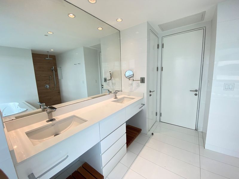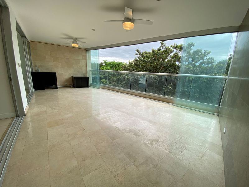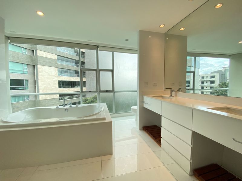 El apartamento está en la 5ª planta con vistas a la montaña. El concepto abierto en las áreas sociales con mucha luz natural, suelos de porcelana y acceso a una gran terraza con vistas a los jardines. La cocina cuenta con sobres de granito, un montón de almacenamiento y está abierta a la sala de estar. El espacioso dormitorio principal será su oasis con una tina de hidromasaje, lavabos dobles y walk-in closets para él y para ella. Los otros 2 dormitorios tienen baños completos y walk-in closets. Aire acondicionado en toda la casa.