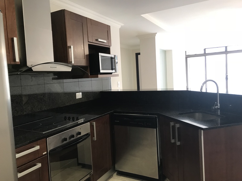 * Cocina con sobres de granito, refrigeradora, horno, plantilla de cocina, extractor, microondas, lavadora de platos y extractor de grasa.