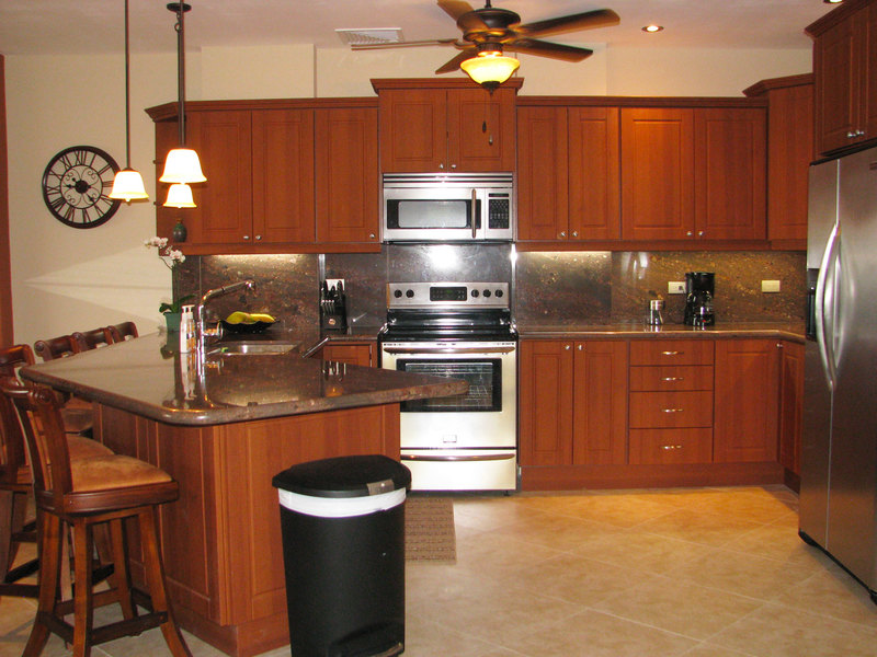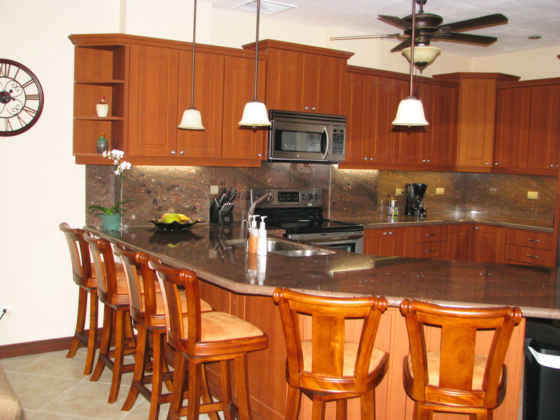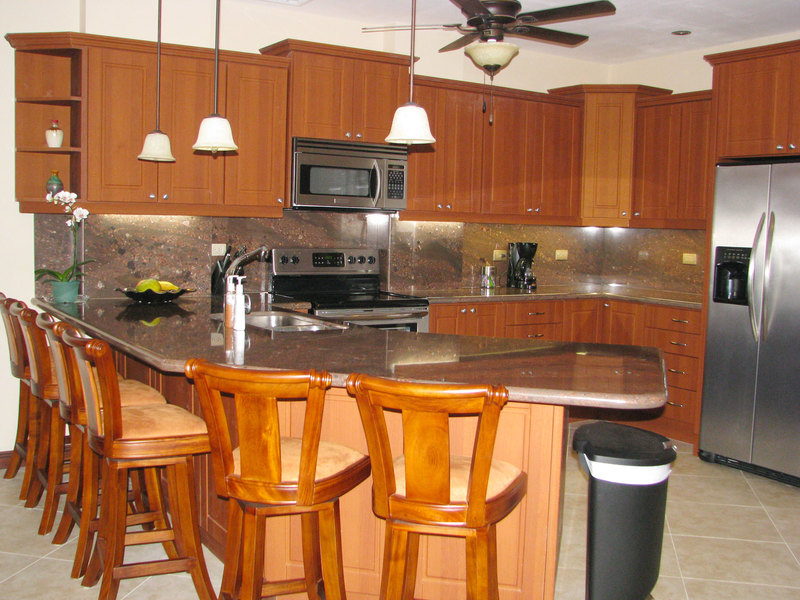 The kitchen has custom hand crafted hardwood cabinetry, large breakfast bar with beautiful granite countertops and stainless steel appliances.