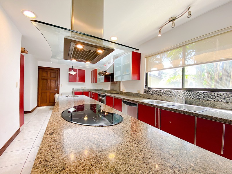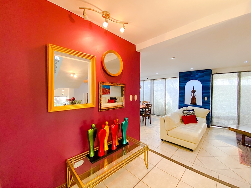 Spacious Town House for rent and sale in Lindora, Santa Ana. Premium gated community. Corner house with exceptional location surrounded by beautiful gardens. 260 m2 construction, 300 m2 land, 3 bedrooms, 2.5 baths, family room, studio, and Maid´s quarters. Open-concept social area with rustic ceramics flooring, lots of natural lighting. Large kitchen with granite countertop, a big center island, and modern built-in appliances. Huge Master bedrooms with visiting area, a full bathroom with marble countertop, double sink, tub, and separate shower, and a walk-in closet. Two additional bedrooms, an additional full bathroom, an attic, a covered terrace, and a covered garage for two vehicles.