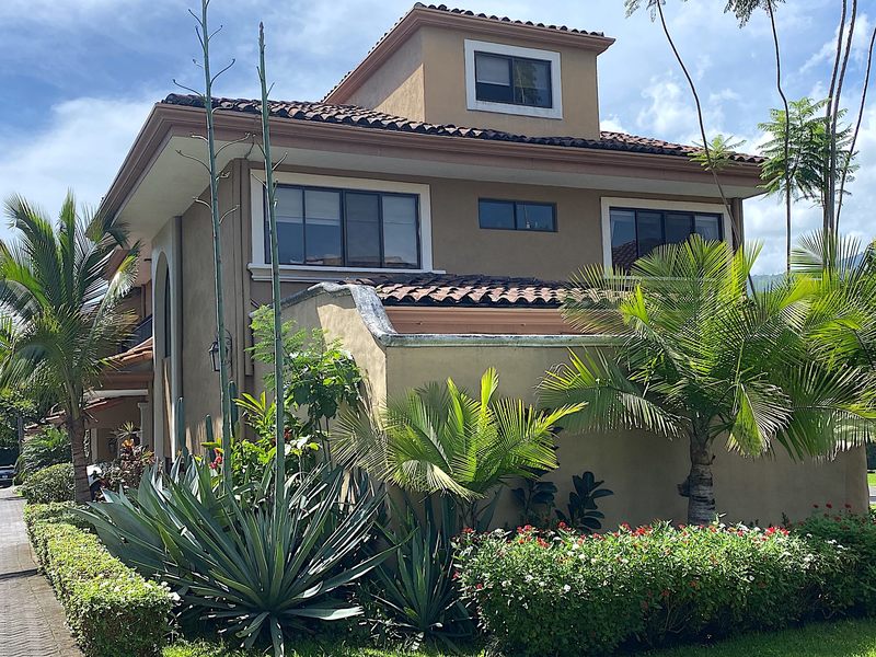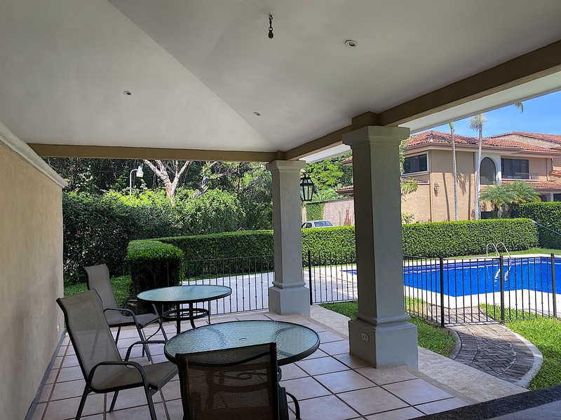 Amplio Town House en alquiler o venta en Lindora, Santa Ana. Urbanización cerrada de primera calidad. Casa esquinera con excepcional ubicación rodeada de hermosos jardines. 260 m2 de construcción, 300 m2 de terreno, 3 habitaciones, 2.5 baños, sala familiar, estudio y cuarto de servicio. Área social de concepto abierto con pisos de cerámica rústica, mucha iluminación natural. Amplia cocina con tope de granito, una gran isla central y modernos electrodomésticos empotrados. Enorme dormitorio principal con area de visita, un baño completo con tope de mármol, doble lavabo, bañera y ducha separada, y un walk-in closet. Dos dormitorios adicionales, un baño adicional completo, un ático, una terraza cubierta, y un garaje cubierto para dos vehículos.