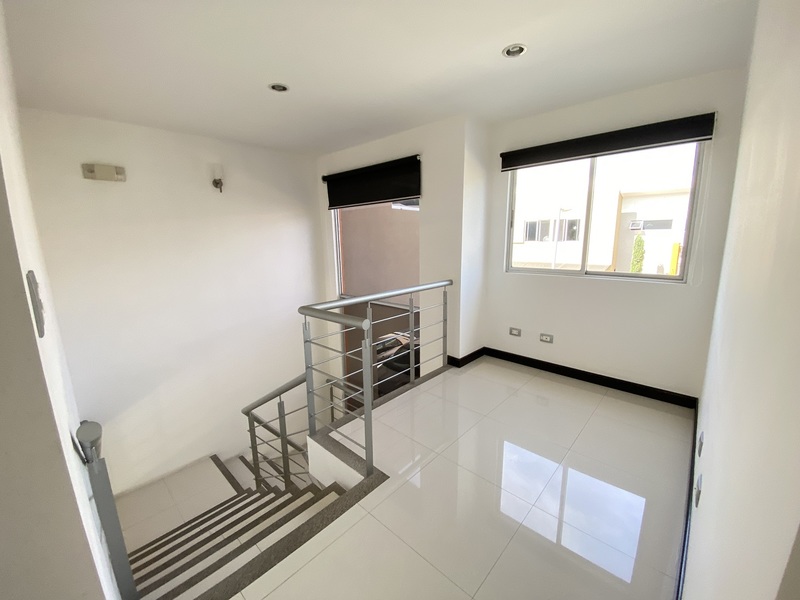 Se Alquila Casa Moderna 3B, 2,5B en Condominio Cerrado en Santa Ana. Convenientemente ubicado en Pozos, cerca de todos los servicios, este condominio es perfecto para familias o personas que quieran socializar con sus vecinos, gracias a sus comodidades: piscina, piscina para niños, parque infantil, casa club y seguridad 24/7. En el primer piso, hay un amplio espacio abierto que combina sala y comedor; un baño de visitas; la cocina con su isla y encimeras de granito; área de TV; un bonito jardín de 50m2; lavadero y un garaje cubierto para dos coches. En el segundo piso, está el dormitorio principal con su propio baño y walk-in closet, y aire acondicionado; los otros 2 dormitorios tienen amplios closets de pared y comparten un segundo baño; y también hay un espacio para oficina. Toda la casa tiene pisos de porcelanato, acabados contemporáneos y mucha luz natural también. ¡Llámenos ahora para reservar una cita!
