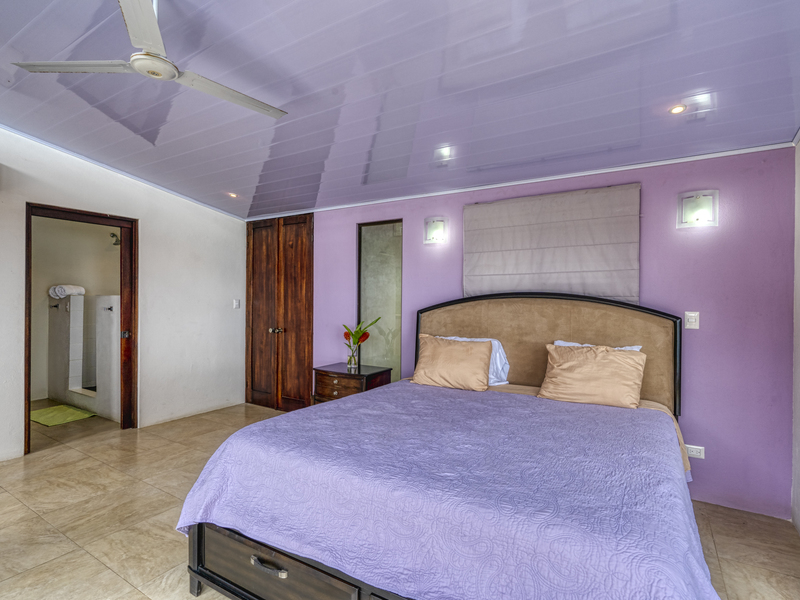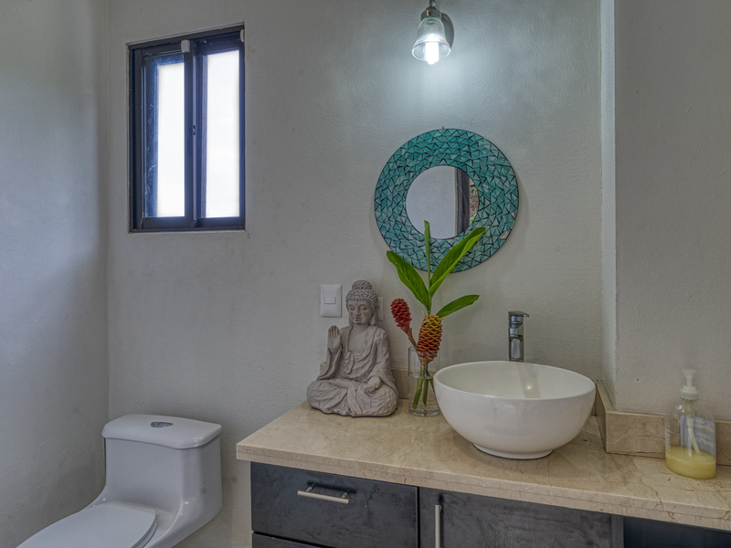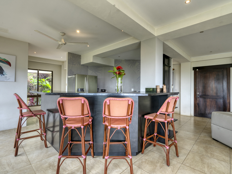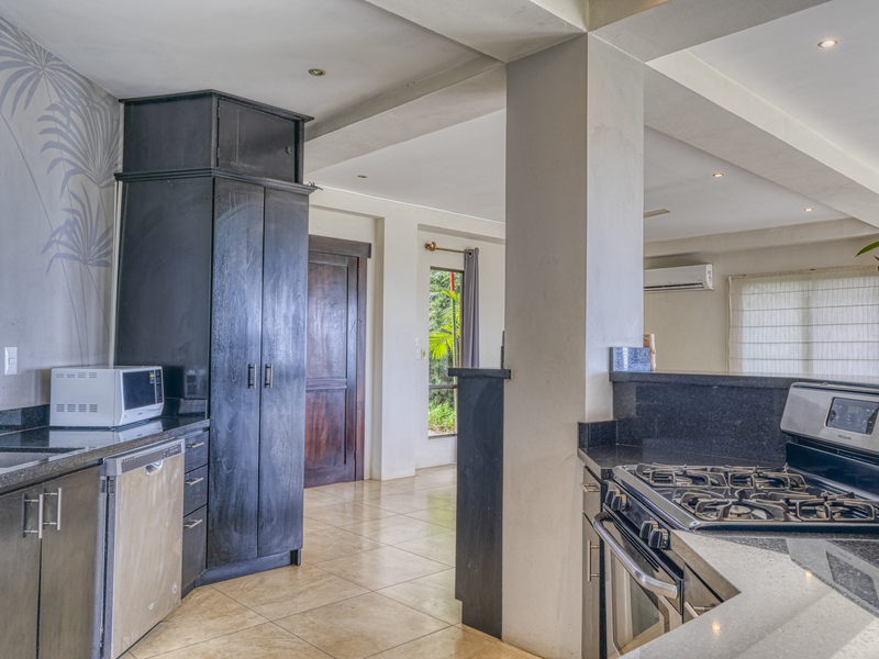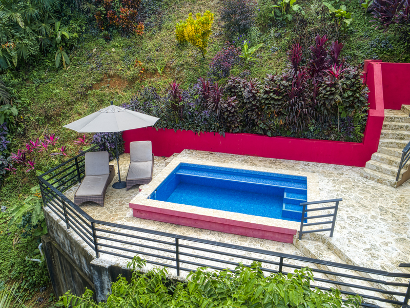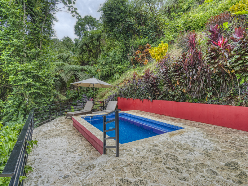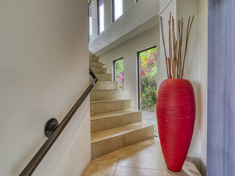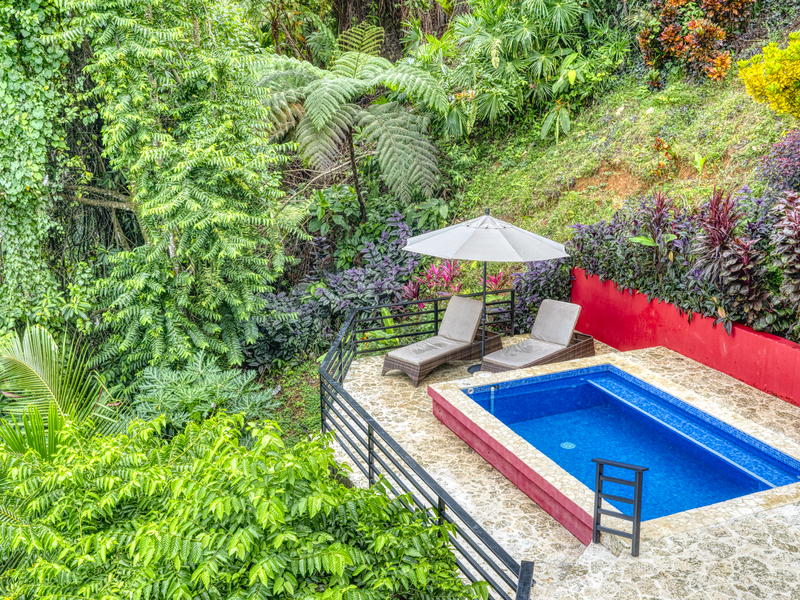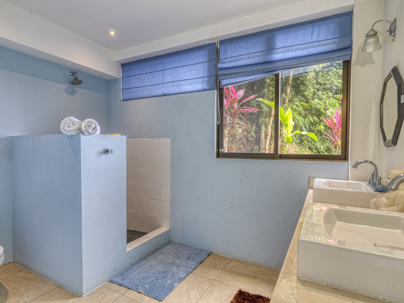 The main patio includes an outdoor sofa, two wicker chairs, and a coffee table. On that level, you’ll also find the infinity pool, where you can spend the day cooling off amidst your own private jungle. Every angle of your luxury villa is filled with landscaping, lush trees, and local flowers. It is a sight to see. For your convenience, there is an outdoor staircase that goes directly from the pool terrace to the third-floor master suite. This luxury villa includes two parking spaces and you will need a 4x4 vehicle to reach the property.