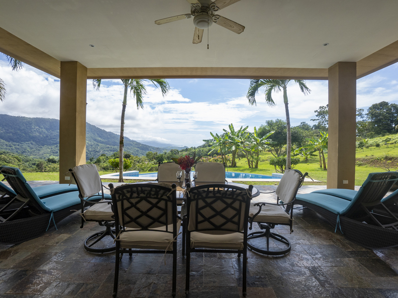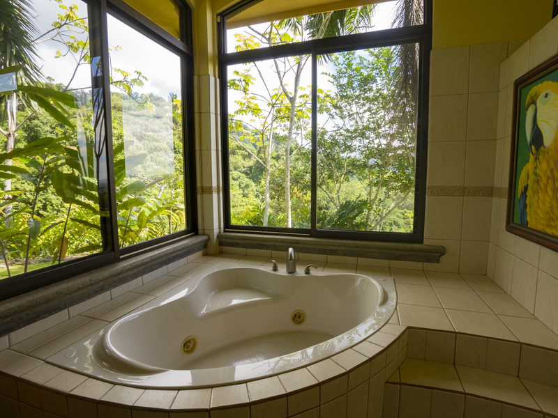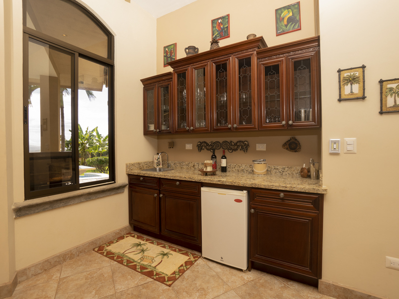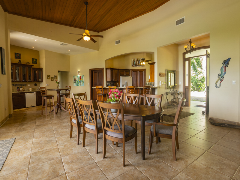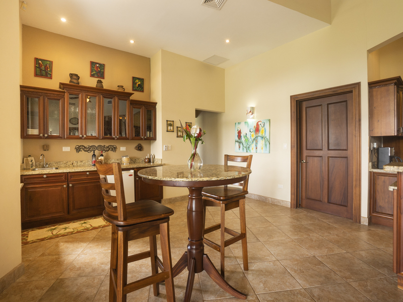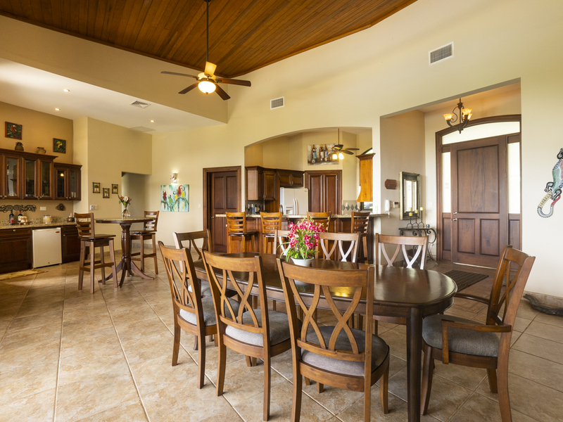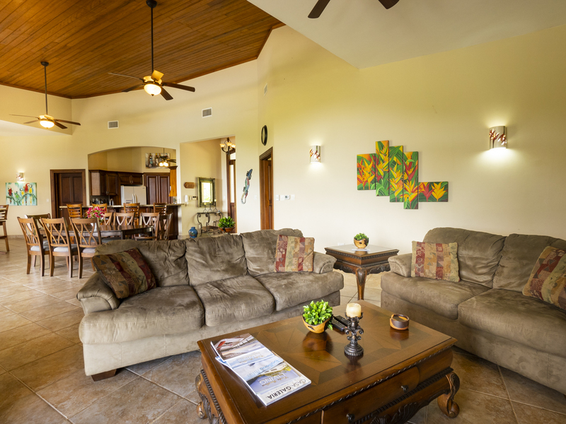 Villa Dahlmar exudes a warm and spacious design, which is evident with the 12 to 18-foot ceilings in the entryway. Every room is decorated in colorful artwork, such as vivid Toucan birds or colorful butterflies. Pops of color add to the shades of cream and browns throughout the house.