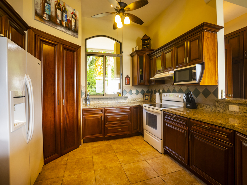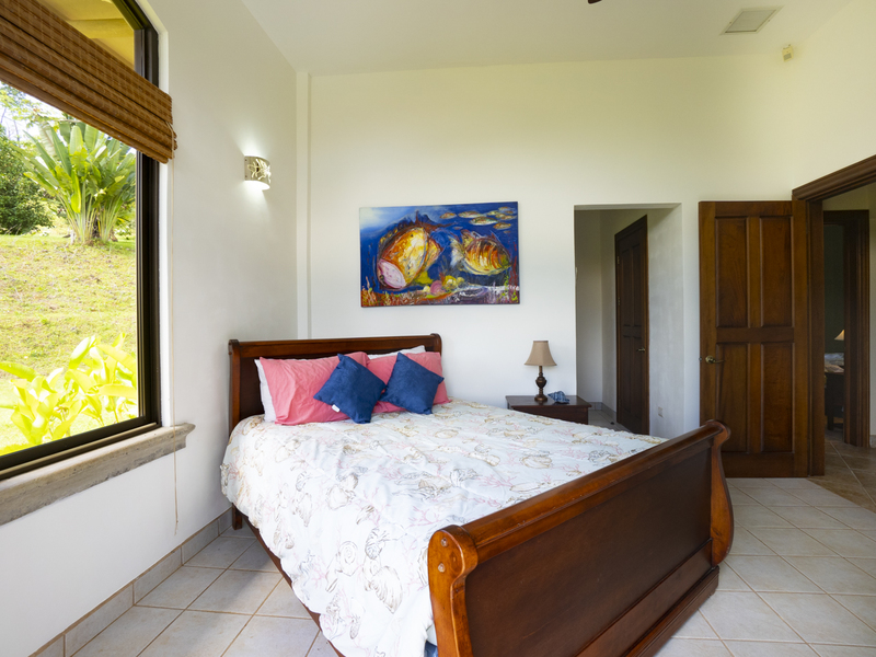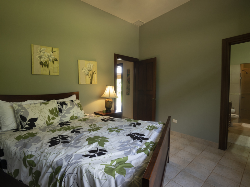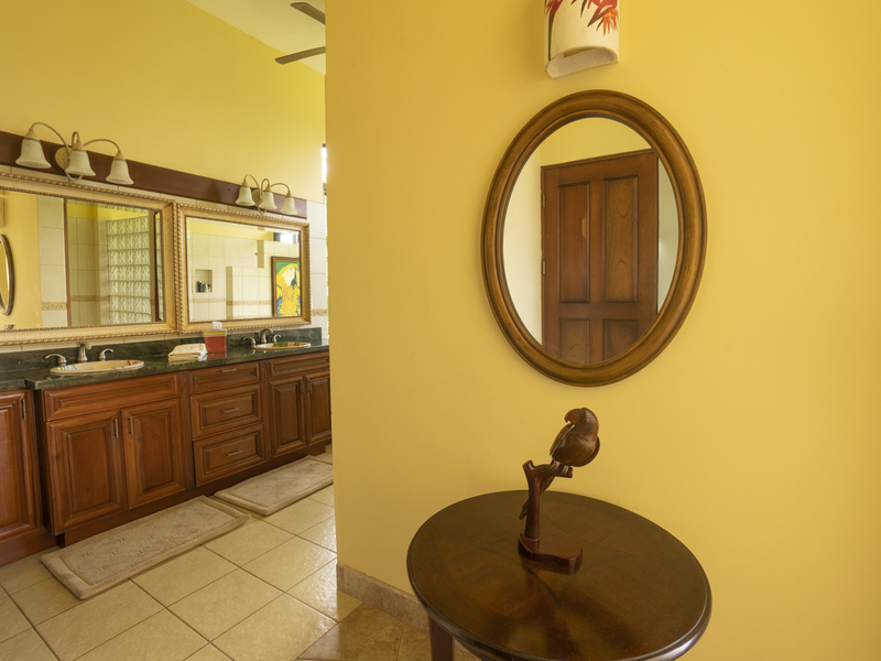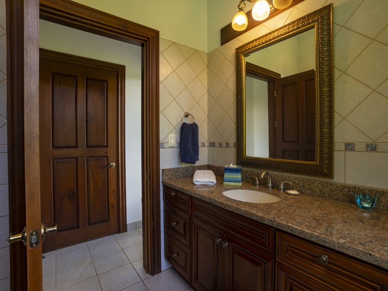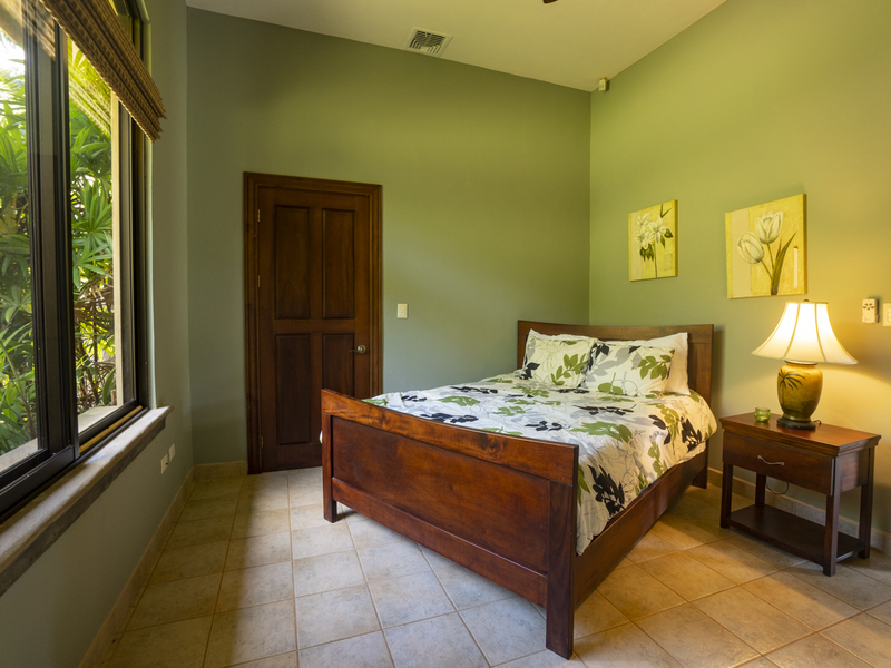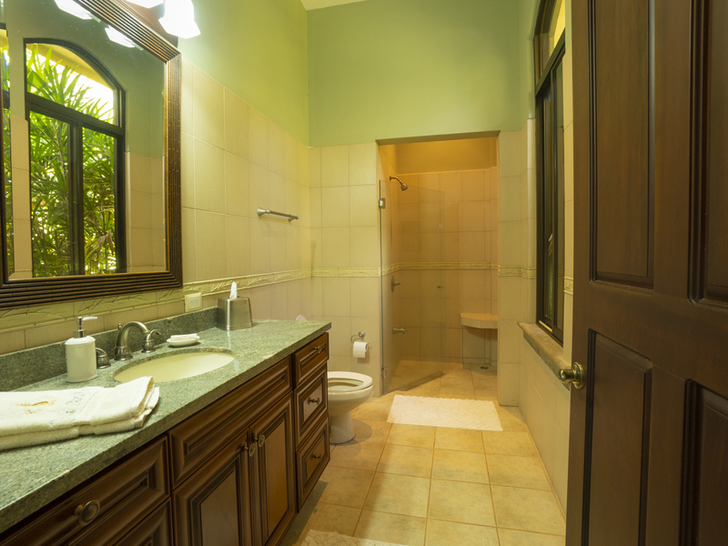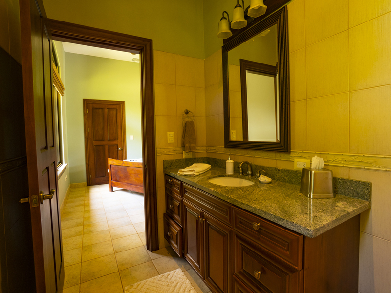 Villa Dahlmar features three bedrooms with three ensuite bathrooms. All of the bedrooms feature large windows and ceiling fans to ideally circulate airflow. The master suite is on the left side of the house as you walk in. It features a king-sized bed with a wooden sleigh-style headboard. In addition, it features a table and chairs, two plush ottomans, and a large walk-in closet with a secured bodega. The master bath features both a walk-in shower with a bench and a Jacuzzi jetted tub, providing a spa-like atmosphere that is also practical. It also includes a closeted toilet and two granite sink basins. The other two bedrooms are located on the other side of the house and feature queen size beds. Those ensuite bathrooms also include granite countertops and white sink basins, as well as a glass walk-in shower with a bench. There is also an office with a couch that folds out into a twin bed, perfect for a guest room. Villa Dahlmar even includes a laundry and storage room to make things easier for you.