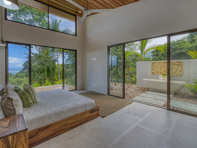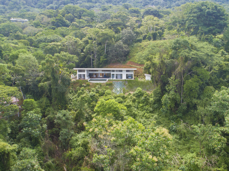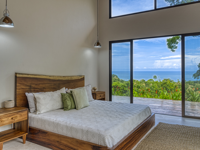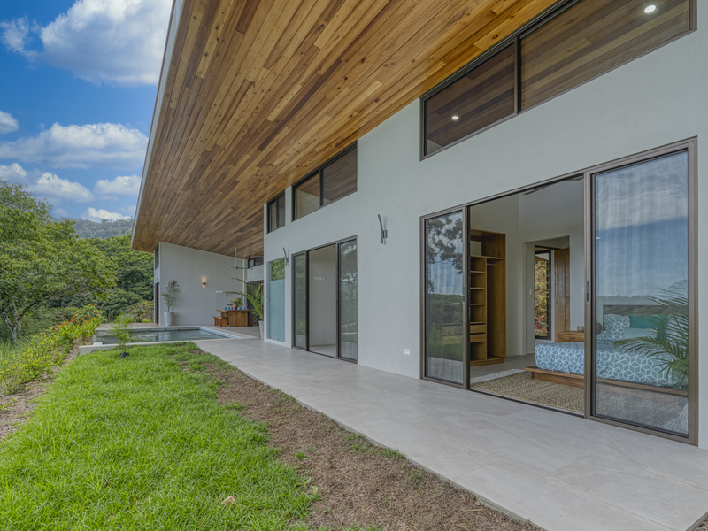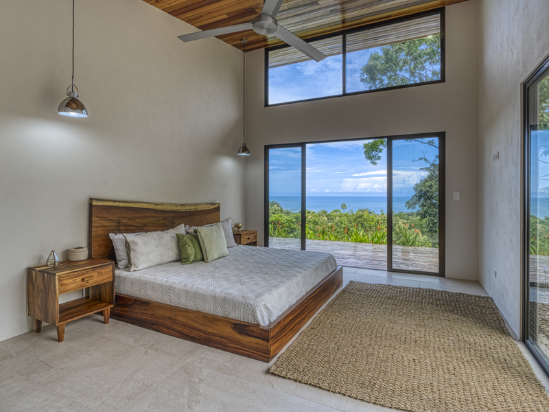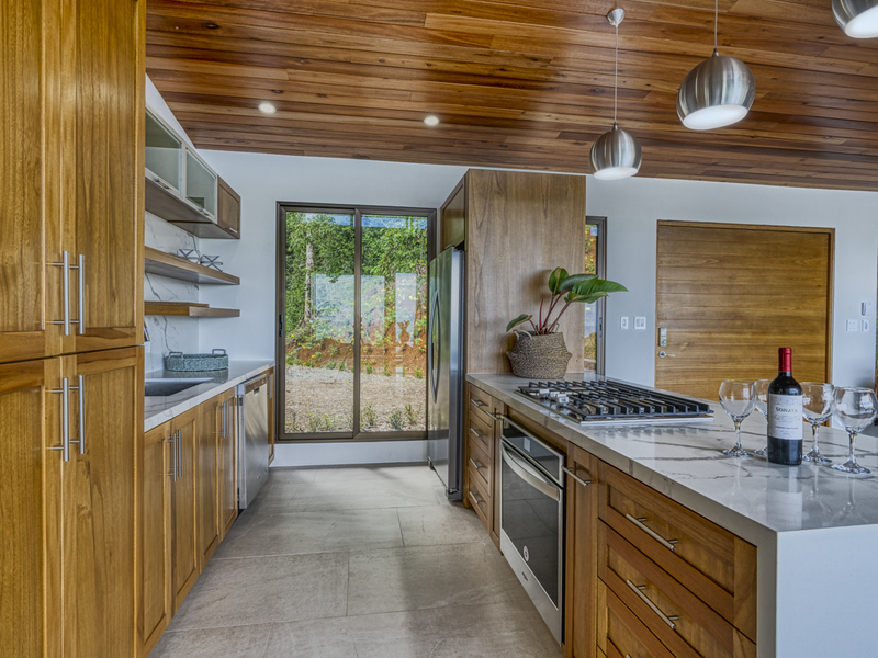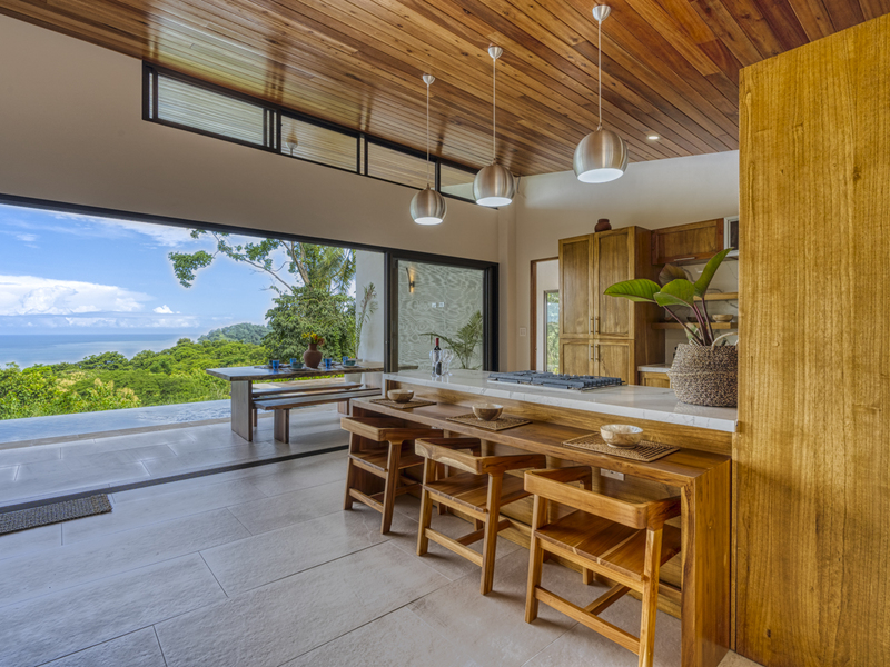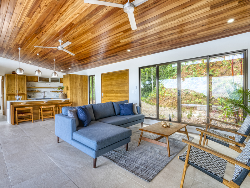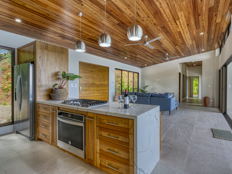 This modern and elegant 2,000 square foot luxury home is located in the hillside prestige community of Marina Vista, part of the scenic Escaleras neighborhood in Dominical. This tropical-inspired home features majestic ocean views from its peaceful setting above Dominicalito Cove. With over 2 acres of beautifully landscaped grounds, this is a perfect setting for tranquil relaxation, and sophisticated indoor and outdoor entertaining. The spacious open-plan interior includes all the benefits of a tropical open space design: clean lines, natural light, glass walls, high ceilings, and glossy tiled floors.