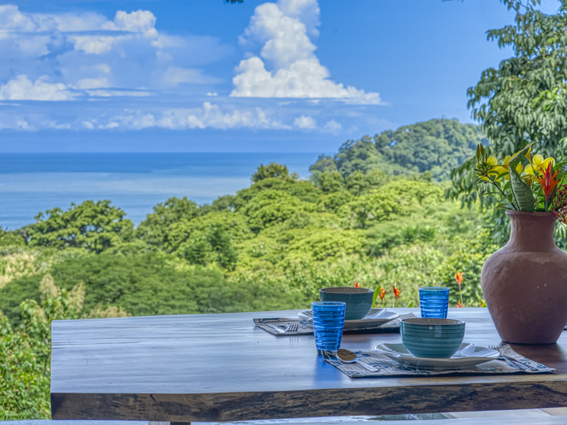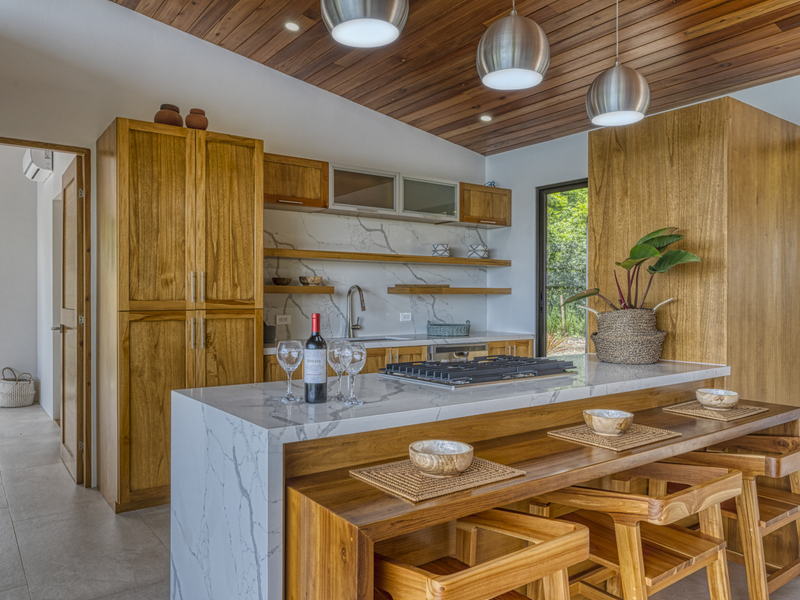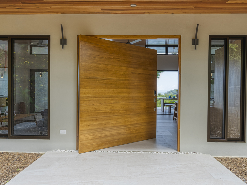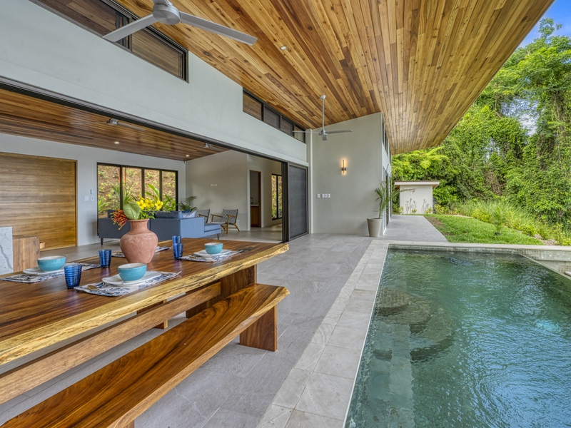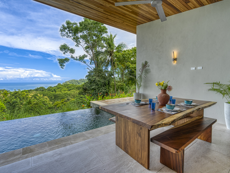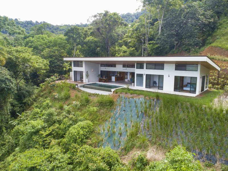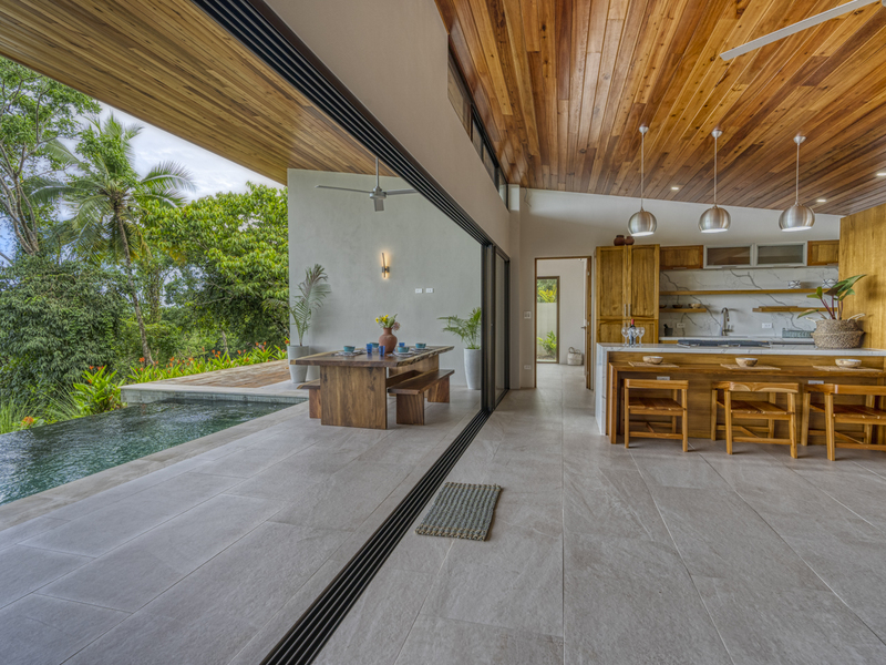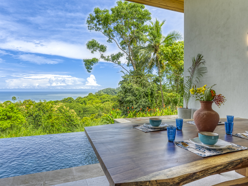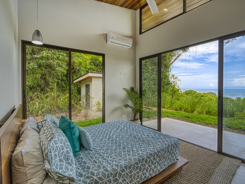 This modern and elegant 2,000 square foot luxury home is located in the hillside prestige community of Marina Vista, part of the scenic Escaleras neighborhood in Dominical. This tropical-inspired home features majestic ocean views from its peaceful setting above Dominicalito Cove. With over 2 acres of beautifully landscaped grounds, this is a perfect setting for tranquil relaxation, and sophisticated indoor and outdoor entertaining. The spacious open-plan interior includes all the benefits of a tropical open space design: clean lines, natural light, glass walls, high ceilings, and glossy tiled floors.