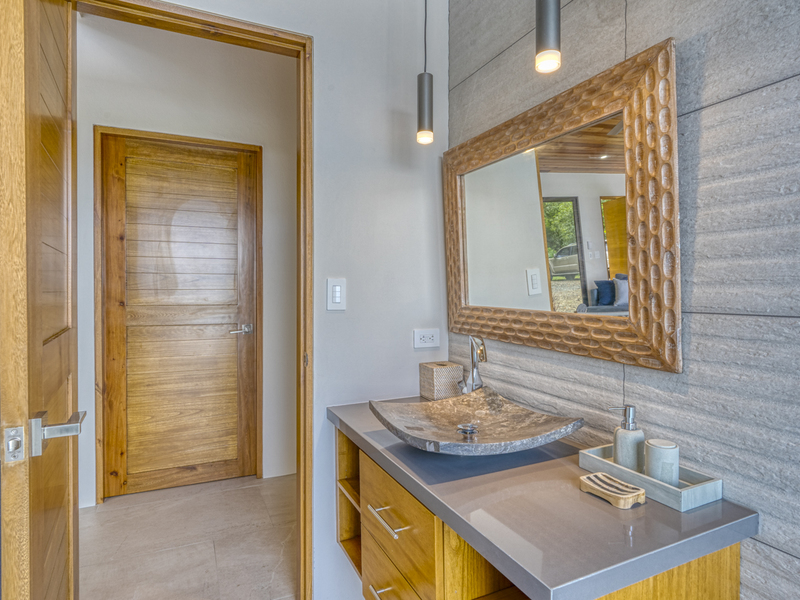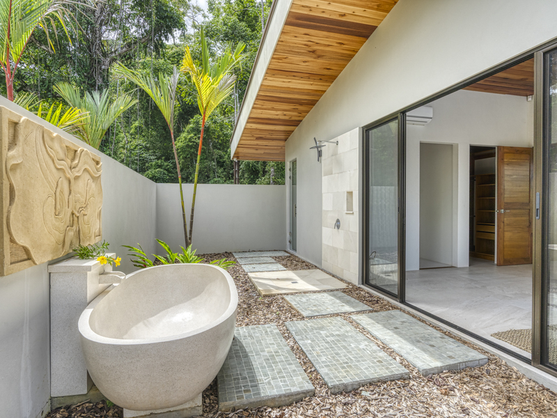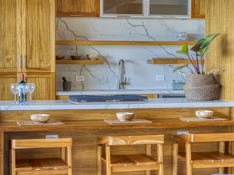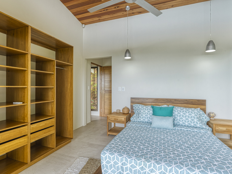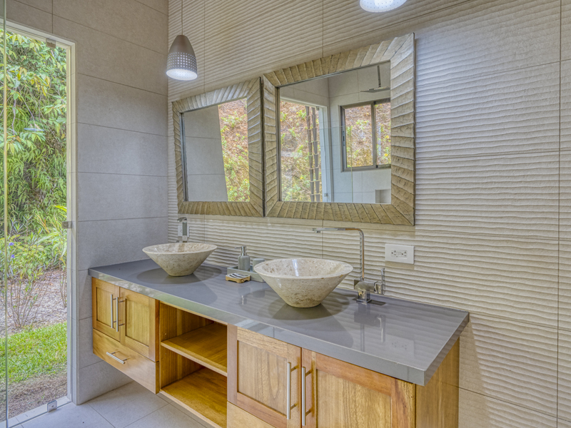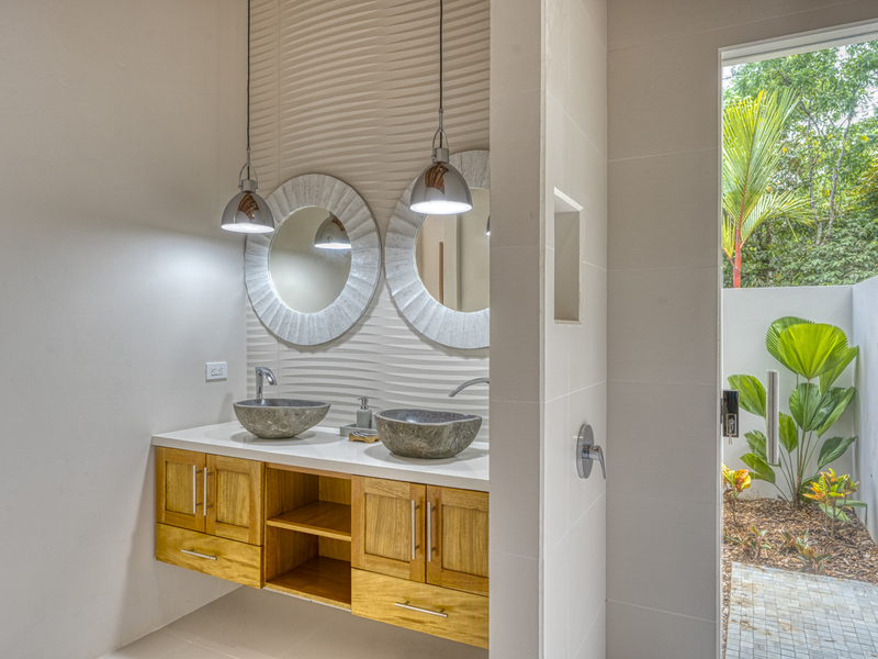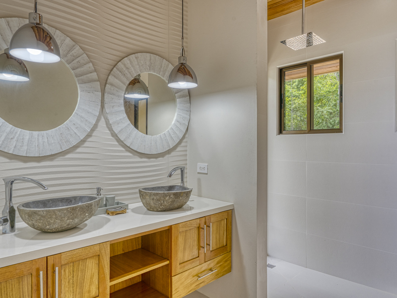 The entire master suite is an ocean-view owner’s retreat, complete with a huge custom closet dressing room. It features a private Bali spa-style bathtub, and a deck overlooking the backyard and ocean. It feels very spa-like amidst the local flowers and trees and ocean views to just soak in a luxurious bath. The suite also includes a separate deck area steps from the bed. The second master suite includes built-in wooden shelves, a wooden headboard, and your own private patio. The ensuite bathroom features two marble vessel sinks, a double vanity, and a glass-enclosed shower with window-access to the outdoor garden. It makes you feel like it’s an outdoor shower in the garden. The third bedroom is unfurnished for now.