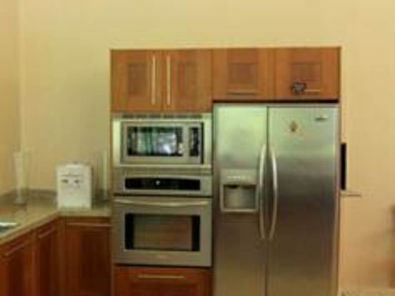 The main floor has a spacious living area and a kitchen with granite countertops, stainless steel appliances and custom made wooden cabinets.