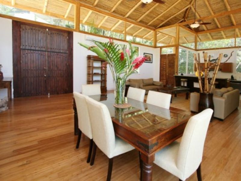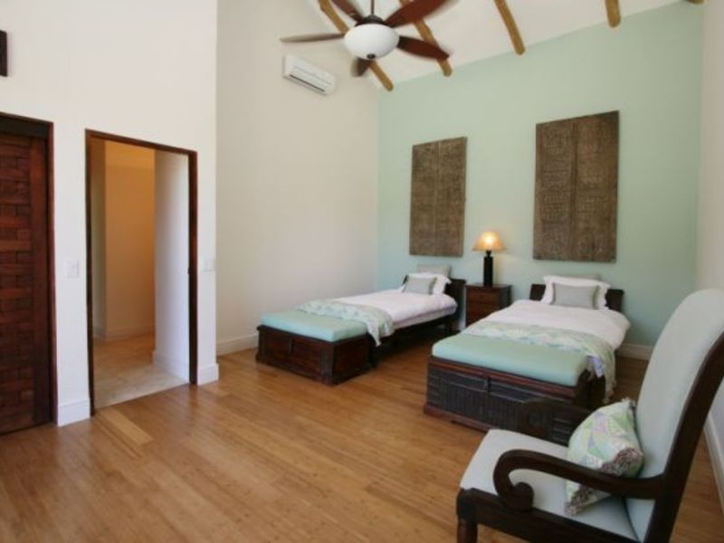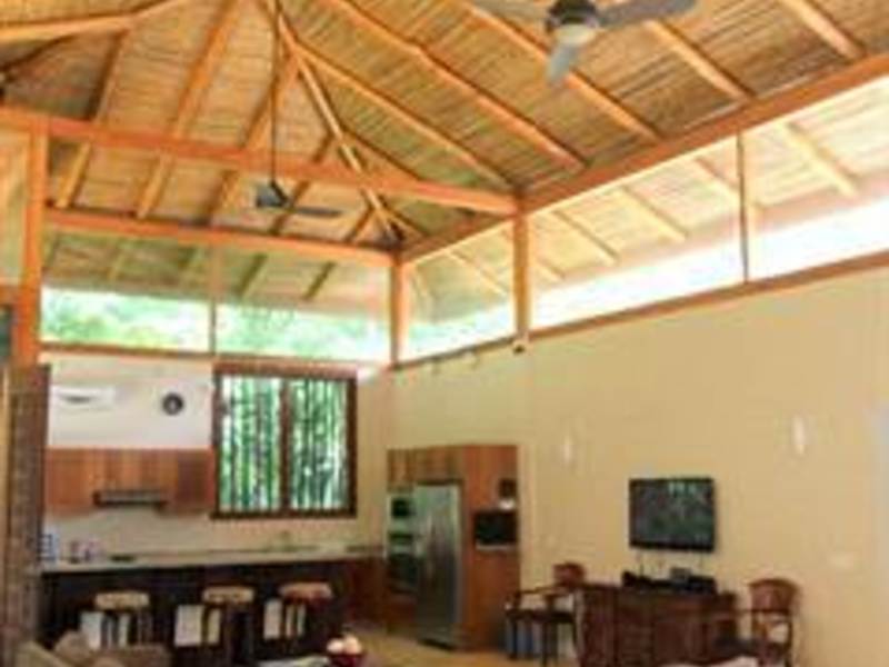 A year-round creek and waterfall that runs through the property, is tropical modern in style with Balinese touches throughout, including the raised bamboo ceilings and very large doors.