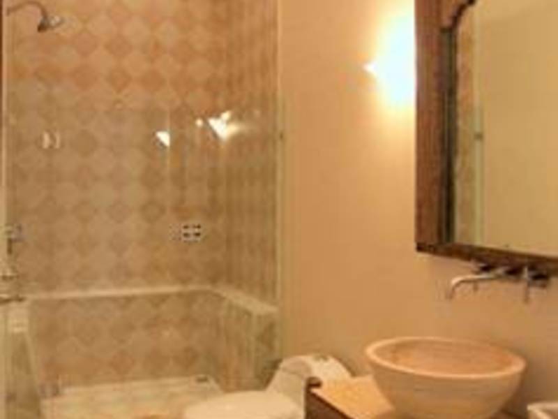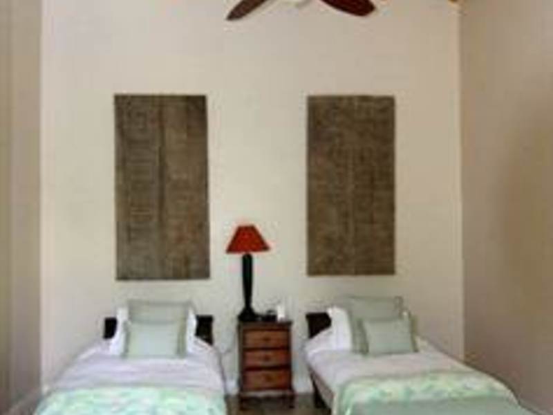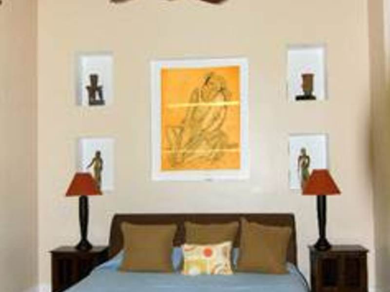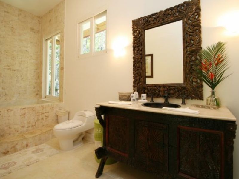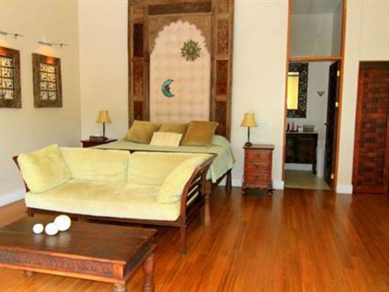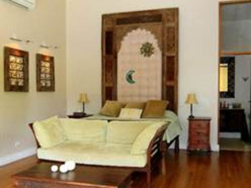 The master suite, located just off the main living area, features a massive Indonesian antique head board and a bathroom in marble stone surface finishes furthermore easy access to the private terrace and down to the central pool and patio.
