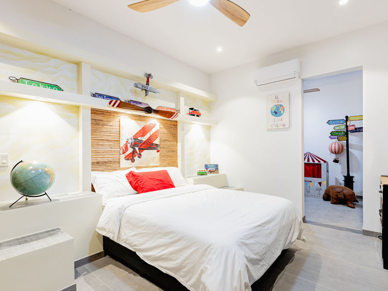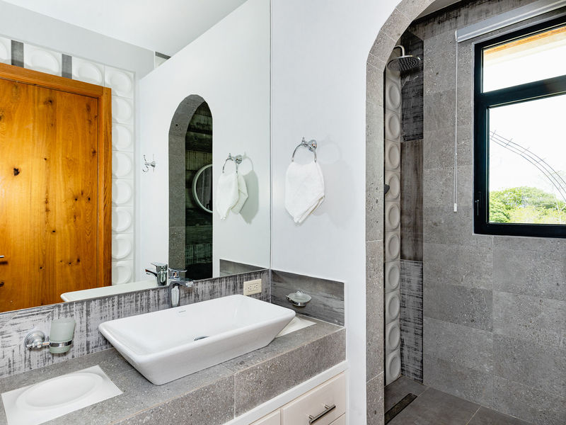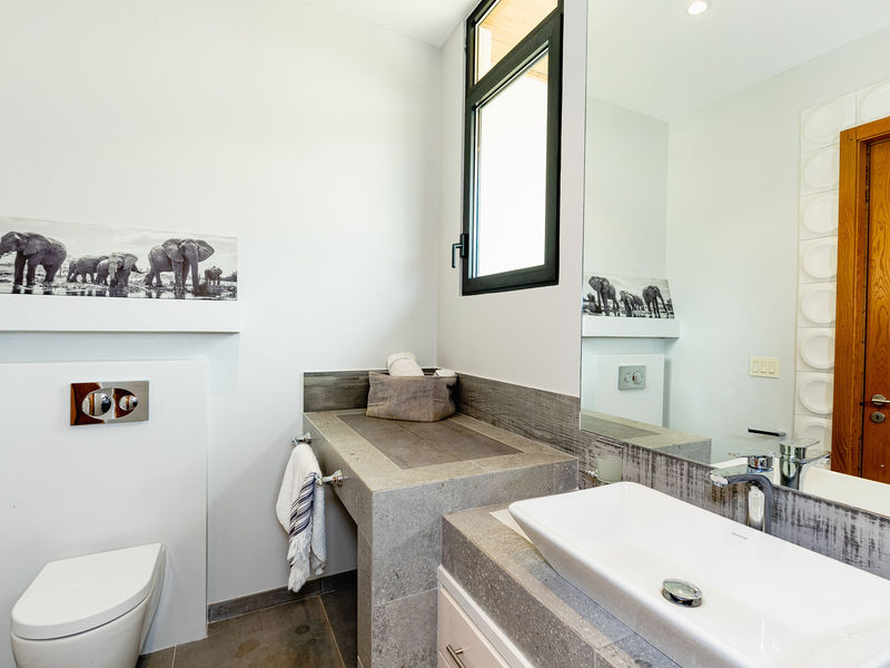 The hall leading to the 3 bedrooms homes a very well designed powder room. The 2 guest rooms precede the master suite. On the left the 1st guest room has French doors offering similar wonderful views to those of the outdoor living area. There is a well equipped ensuite and room to have a walk in closet, this is currently being utilized as extra space for children to sleep with a bunk bed in place. The second guest bedroom offers an ensuite bathroom of high quality, shown throughout this home, along with a walk in closet area.