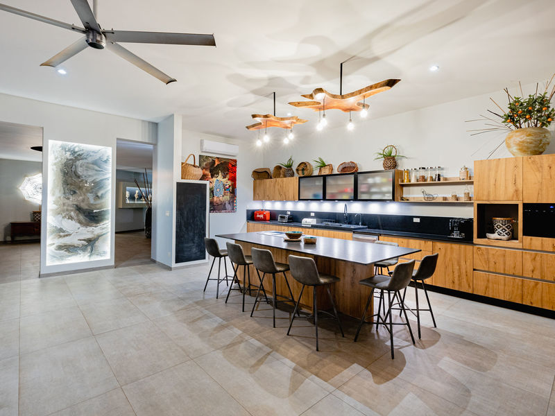 The kitchen and living area share one large open plan room which leads to the outdoor living space, swimming pool and BBQ area. The kitchen was made and imported from Germany and has been tastefully combined with local hard woods to give a warm yet well designed and manufactured feel. The island is home to the 6 burner induction stove and external extractor fan, also doubling as extra storage and seating room. There is also 6 person sitting area with a lush view of the valley and the hills beyond next to the pantry and storage area. The indoor living area adjacent to the kitchen is equally well finished and designed, again with imported furniture. There is a tv nook with sofa as well as a segregated coffee table and lounge chairs.