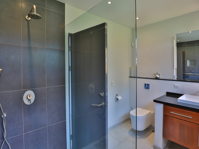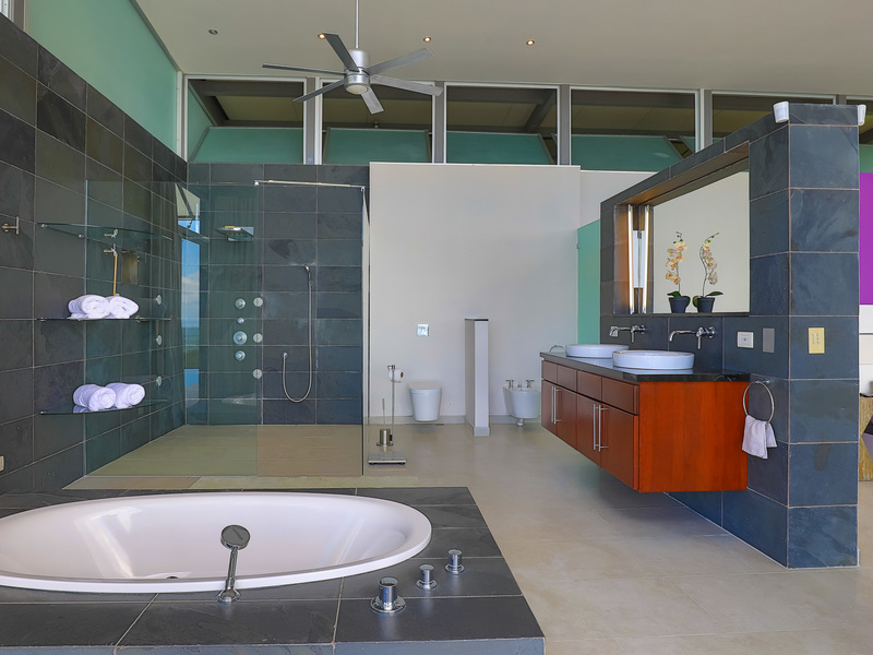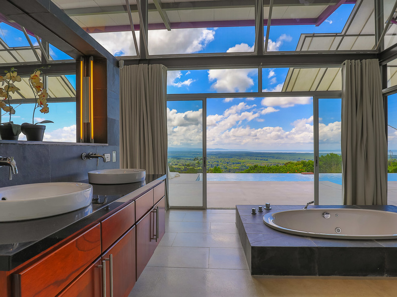 The three bedrooms, each with its own exquisite view, are laid out on a single-story, with a separate master bedroom and guest room wings on opposite sides of the home to maximize privacy and comfort. The master bedroom opens onto the sunset view of your dreams, to be enjoyed directly from the bed. The master bath features a large European spa tub to comfortably accommodate two, and a separate multi-function rainfall shower. The guest wing of the home contains two guest rooms which can be used for visitors or as an office or home studio. Between the two bedrooms is a shared bathroom elegantly finished in the same high-end quality as the rest of the home. The shared dining, living, and kitchen spaces feature many design elements. You will find a sophisticated kitchen finished in tasteful black granite.