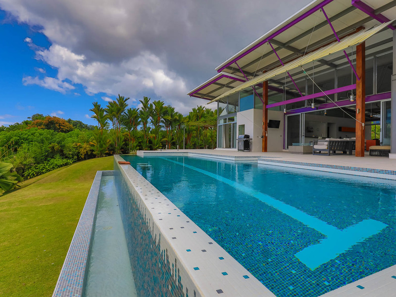 Additional details such as a built-in bookcase, illuminated stairs, and more are all evidence of the extensive consideration put into the construction and completion of this home. Walking through the large sliding glass doors in the back, you enter the newly-finished deck and the crown jewel of this home: the stunning re-designed infinity pool, setting the stage for your spectacular view. This Olympic sizes pool includes Italian tile and a swim-up bar to toast the sunsets. Halfway down the south side of the property, you will find an elaborate plant nursery. The main garden consists of mature fruit trees that flower annually.