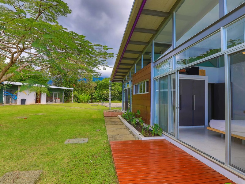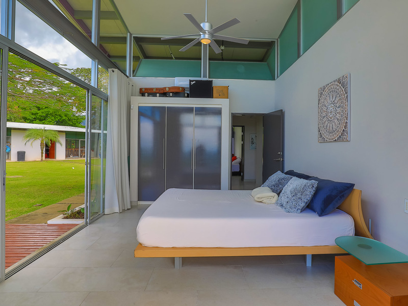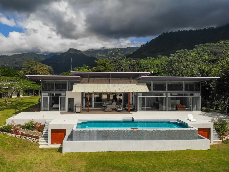 This is a signature luxury modern residence at the top of the private hills of Tres Rios. The design is a contemporary take on Bauhaus modernism, featuring steel and glass construction that uses clean lines and open spaces to create a natural flow between the domestic interior and natural exterior of the jungle.