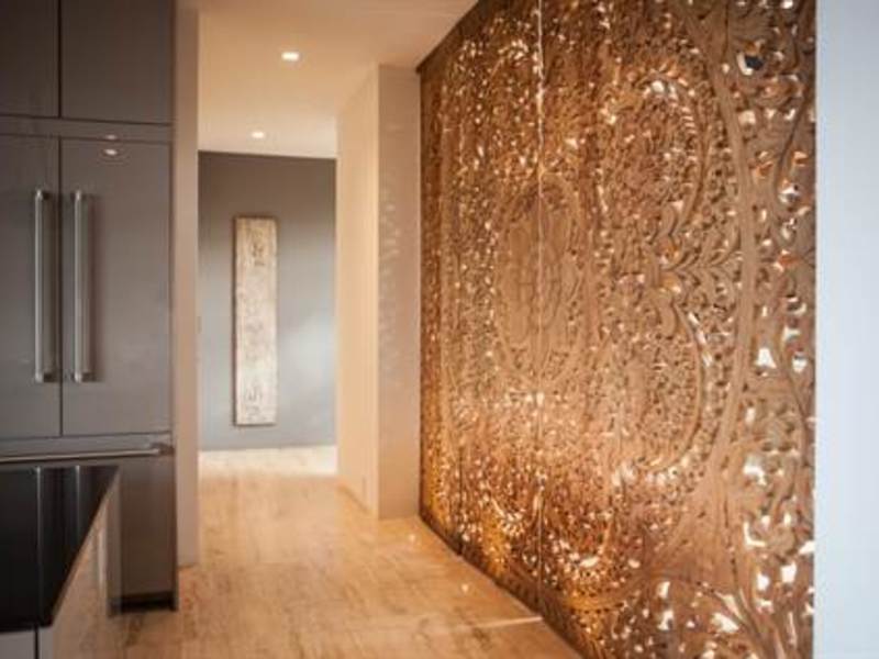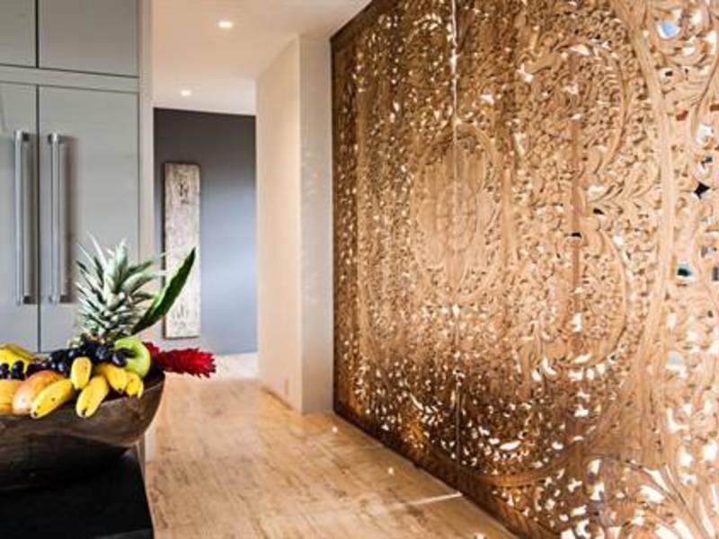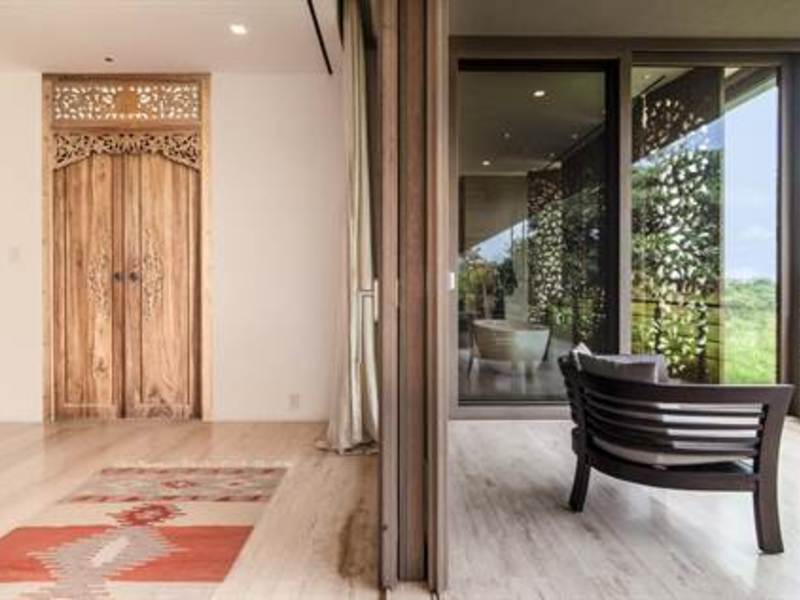 In addition to the delightful custom lighting, the Mandalas exhibited throughout the home were hand and custom made in Bali. All three bedrooms are large master suites with distinctive features that complement the overall design. In the Mandala suite specifically the bathroom is an oasis all its own with a Victoria and Albert soaking tub to relax and take in the incredible views over the Pacific.