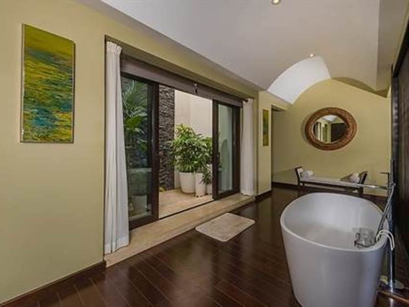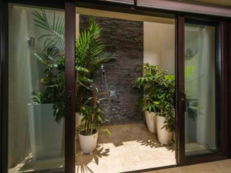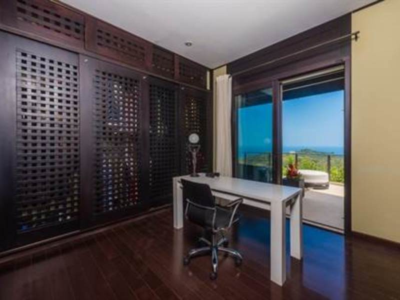 There are 3 bedrooms in the home. Two large and exquisite bedrooms with king beds along with 2 murphy beds in the fitness room/third bedroom exist in this home. It can accommodate up to eight guests. Two bedrooms offer king size beds and en-suites, with the master hosting separate his and her en-suites. The master bedroom suite encompasses the entire 2nd floor and features 2 private large terraces with plenty of outdoor seating and lounging furniture, 2 complete ensuite bathrooms each with walk in closets, a stand alone bathtub, a private outdoor shower, and office area with a view, and a daybed with the most spectacular views.