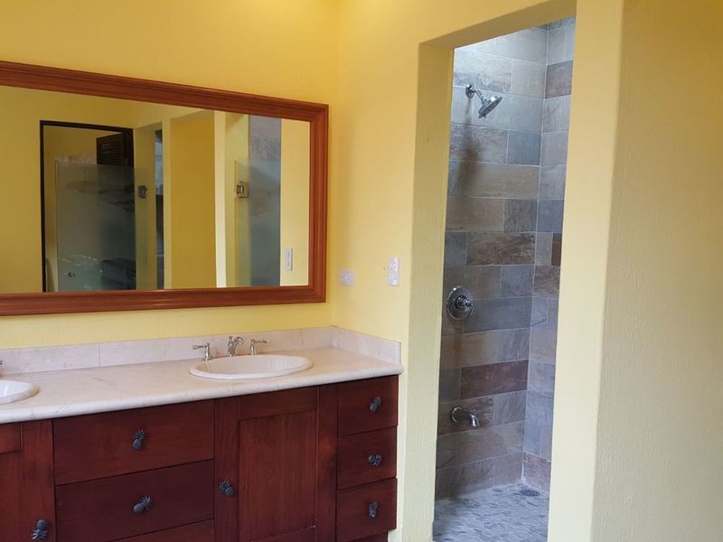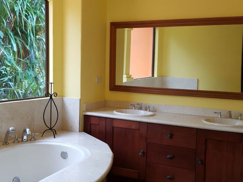 The wrought-iron and mahogany staircase leads to the second floor, reserved for the spacious master bedroom for maximum privacy. The covered terrace provides the same amazing views as the ground level. A double sliding door opens-up to the mezzanine area with ocean views. The master bathroom has a his and hers sink, Jacuzzi, walking shower and huge walking closet as well as a separate room for the toilet.