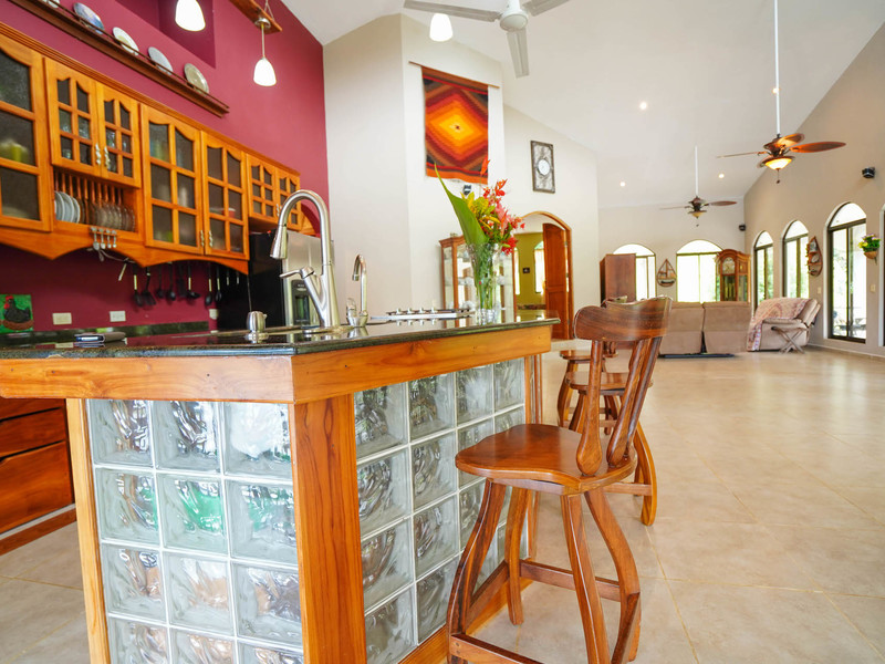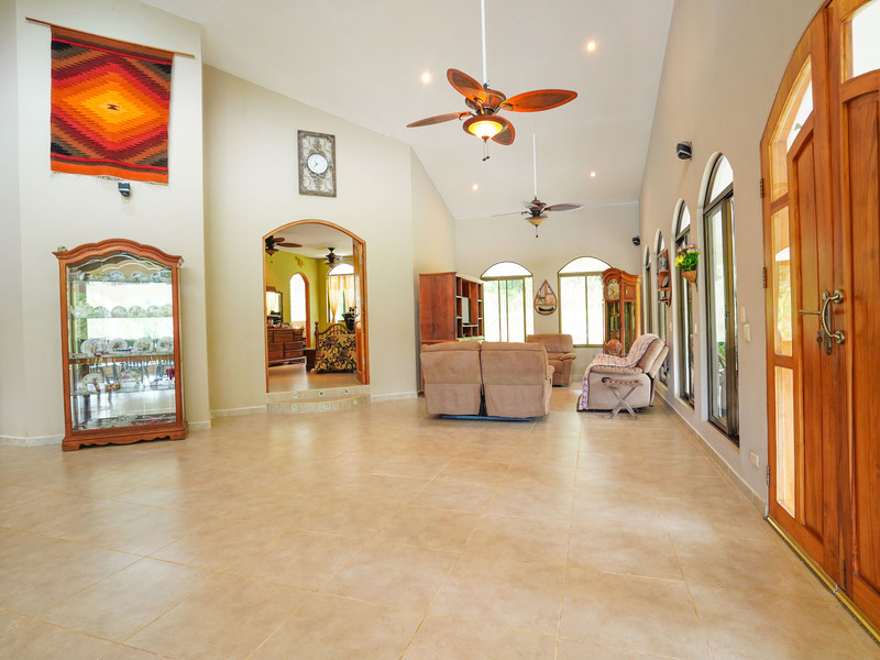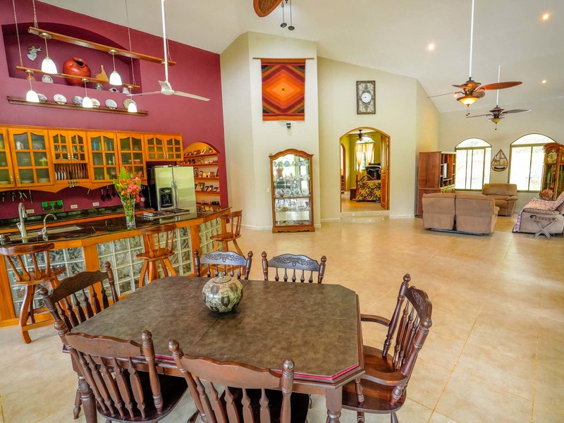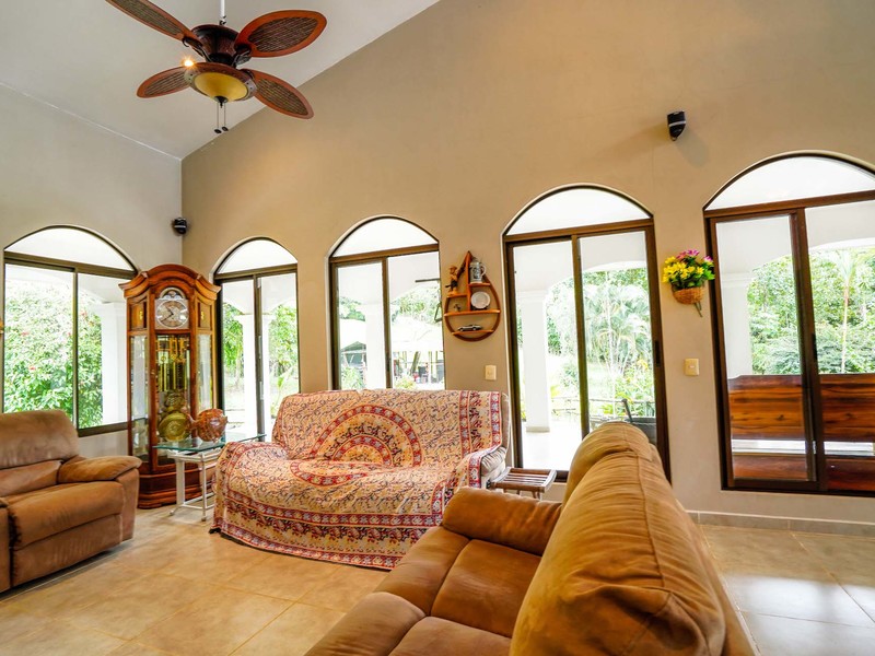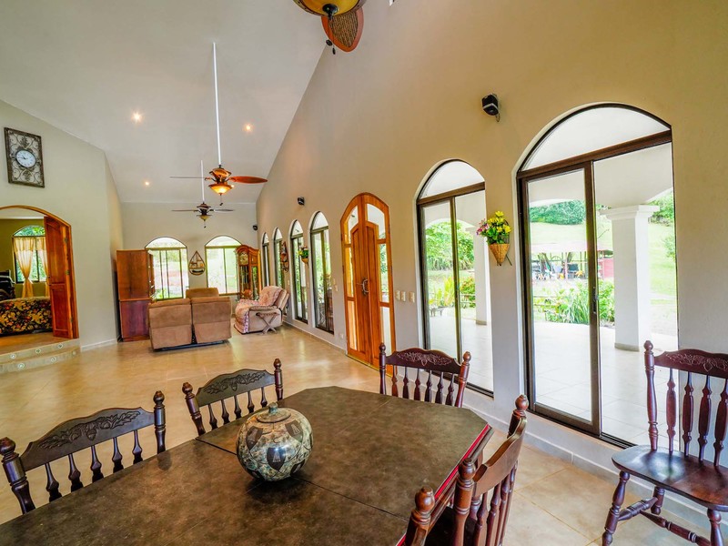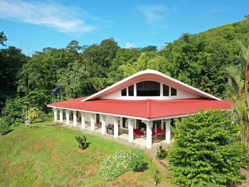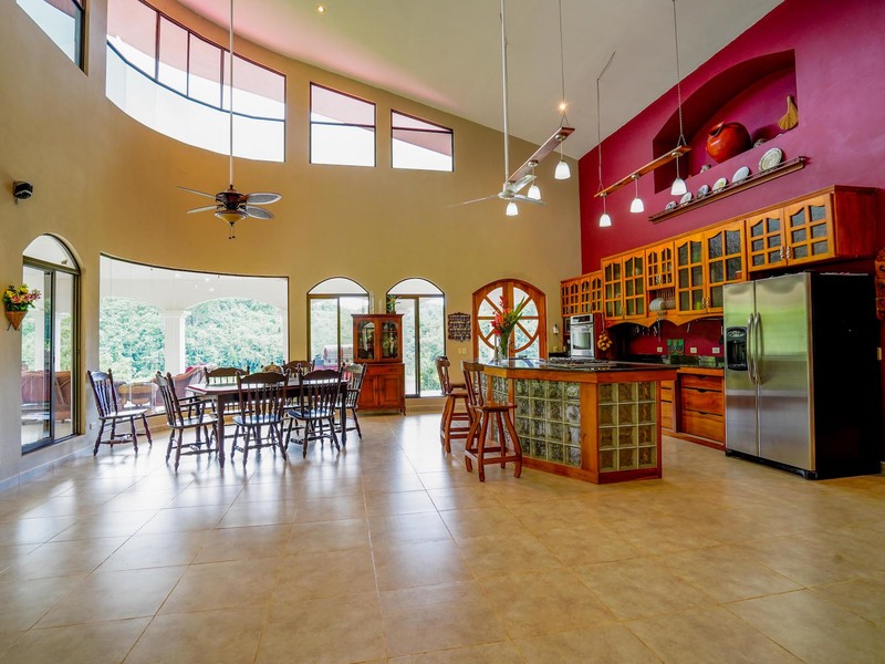 Rolling hills, a year round river, amazing water falls, lush tropical landscaping, and tranquil surroundings are the back drop to this executive ranch estate, just 20 minutes from the marina in Quepos. From the moment you pass the grazing horses and you approach the main gate, you immediately feel the positive energy that this magical property exudes. The modern construction, with unique rooflines, offers a grand hilltop presences as you look up from the quiet well-maintained street. There are no words to describe the beauty of this 16-acre estate, other than 'paradise'. The home design is a masterpiece, with an amazing layout, which maximizes the entertainment and living space in this sprawling 3-bedroom home. At approximately 5500 sqft, this executive quality ranch offers 3 bay-attached covered parking stalls, as well as a lower partial basement and work area...it is a man's dream that is balanced by every women's dream kitchen that awaits just inside the custom made teak doors. The indoor and outdoor living spaces perfectly compliment each other with huge wrap around porches, custom glasswork, luxurious tiles, high vaulted ceilings, custom hardwood cabinets, doors, and shelving units and recessed lighting. The orchestra of running water, tropical birds, exotic wildlife and laughter will provide your guests with hours of enjoyment. Whether you are entertaining 100 people for a cookout, or an intimate family gathering, this property offers space to stretch out and to let go. There is a modest caretaker home on the property that will provide adequate living quarters for your staff.