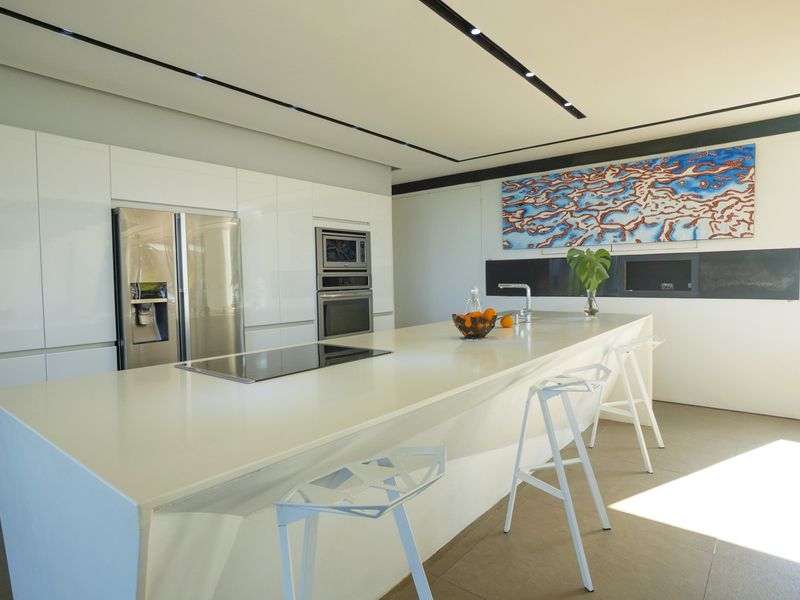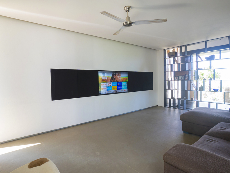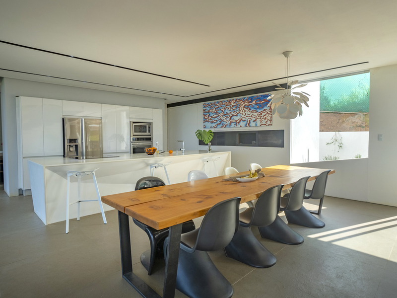 This house is light and open with modern touches. The entire house is done in white, and those homeowners wanting a white kitchen will love this house. The kitchen features white cabinets, a white Kitchen Island, and white barstools. It also includes stainless steel appliances, a wooden dining table, and seating for eight. Some colorful artwork on the walls brightens it up. The kitchen flows right into the living room. It features an off-white sectional and two off-white ergonomic chairs. The living area also includes a glass coffee table that uses tree stumps as the base. In fact, you’ll see several tree stumps as décor throughout the room. The living area leads out to the cement patio and the pool area. Both of these areas need some work but you’ll be able to add your own charm to it.