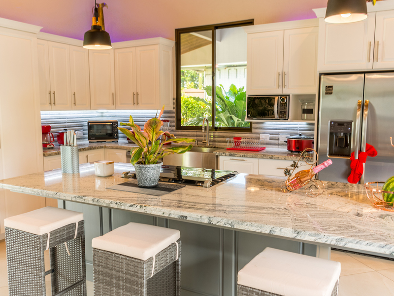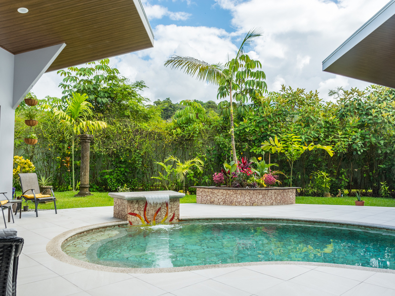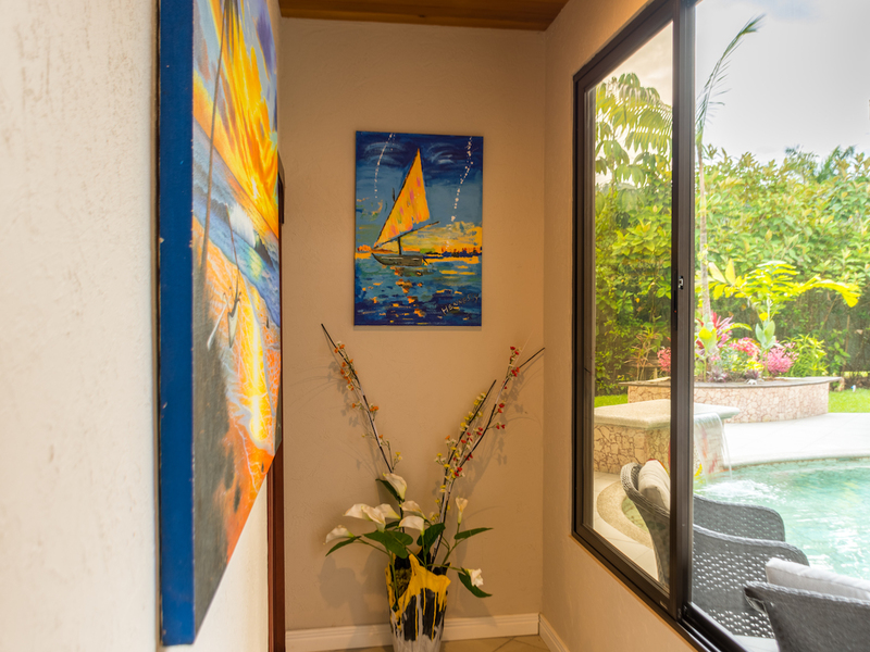The lovely waterfall feature greets you upon arrival to the property. When entering the home you immediately begin to notice the custom details and beautiful woodwork. The open kitchen, dining and living area are well appointed and offer a comfortable space for socializing. The kitchen features stainless steel appliances, custom farmers sink with garbage disposal, granite countertops and custom cabinetry. The master bedroom has a private location with direct access to the pool area, inclusive of an en suite bathroom featuring a duel shower and secured storage. The second guest bedroom is located on the other side of the home with a private en suite bathroom.