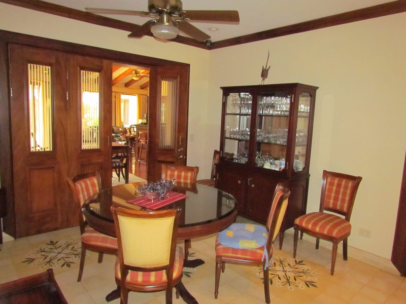 Esta hermosa casa colonial se desarrolla en una sola planta. Entrada del vestíbulo amplio con baño de visitas completo. Las salas y comedor son muy grandes, con techos altos ideales para reuniones sociales. Las salas de estar y el comedor están conectados a una gran sala social y luego el gran jardín con su gazebo y preciosa vegetación. Tres dormitorios cada uno con su propio cuarto de baño. El dormitorio principal con gran vestidor y salida al gran jardín en la parte trasera de la casa. Oficina amplia que puede servir como un dormitorio de invitados. Agradable cocina bien ventilada con desayunador, despensa y muchos gabinetes. Cuarto de lavado, cuarto y baño de servicio, área de bodega, un garaje para 3 vehículos y parqueo suficiente para muchos más en el driveway.