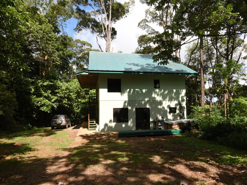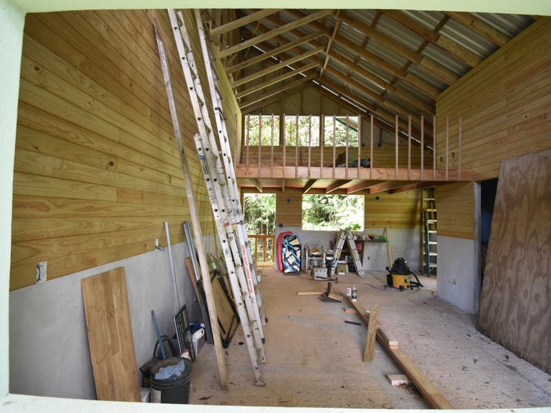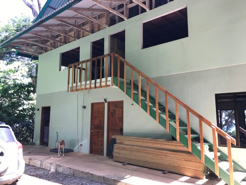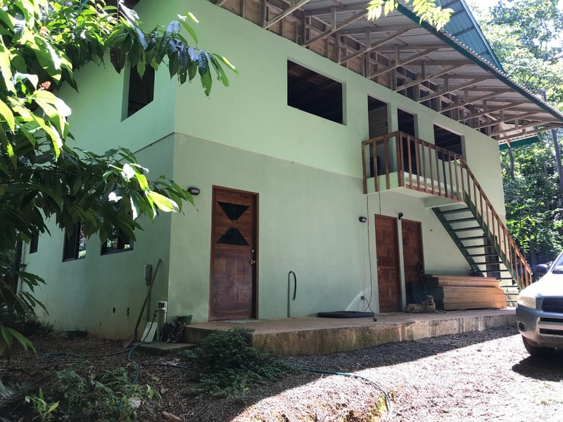 There is already a 2-story, 2,400 square foot building that is livable but not yet finished. The first floor could be one big open space for groups, classes, parties, dance lessons or whatever, or it could be divided easily into two bunk rooms or cabins each with its own bathroom. The second floor will be two cabins that are mirror images of each other, both plumbed and wired for full kitchens, loft bedrooms, bathrooms and views of the jungle and ocean.