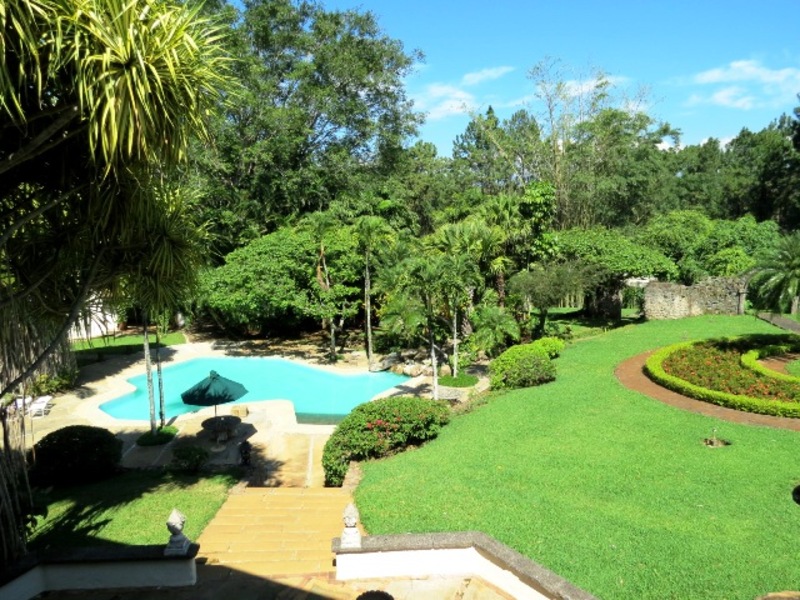 The property consists of 4.8 hectares. The main colonial house has a construction area of 1.100 square meters (11.836 sq. feet). High ceilings keep the living areas cool. Wide terraces around the house allow the breeze to come in from different directions. The sense of space is luxurious. The typical colonial arch motif echoes all around the interior of the house and in the welcoming terraces. It is sober and elegant. The typical red tiles on the roof, the red tile on the floors, and ceramic details on the steps add warmth. The use of solid, dark wood for the doors, big mirror frames, beams, bannisters, benches, and cabinets sets a tone reminiscent of stern Spanish colonial tastes, as do the iron decorated bars and the decorative stone walls. The house features a small scale, tower-like structure with a small dome and narrow windows. Seen from the blue swimming pool, it conjures images of Spanish colonial churches. Glass lamps, iron chandeliers and lamps, and XIX century antiques on doors and walls provide ambience. The house also has satellite TV system, cable, home theater, surround sound system, air conditioning and a fireplace (both rather rare in Costa Rica), a large laundry area, and maids quarters.