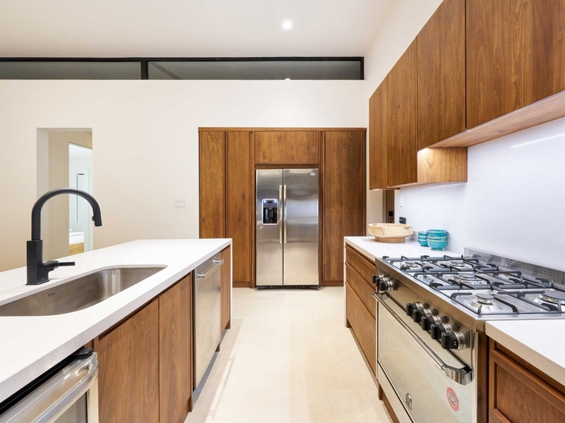 The living room and kitchen have a bright open floor plan, high ceilings and extra large sliders that open up completely to the magnificent pool area and dry tropical garden, for easy in-outdoor living. The 10-feet long dining table seats 10 guests comfortably and the kitchen island offers additional bar seating. The kitchen is professionally equipped with a large gas stove, dish washer, additional wine cooler and large pantry. A separate bodega has enough space to store surfboards, bikes and laundry room. This exceptional home is a must see!