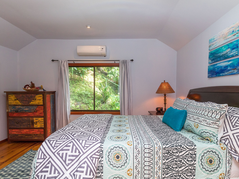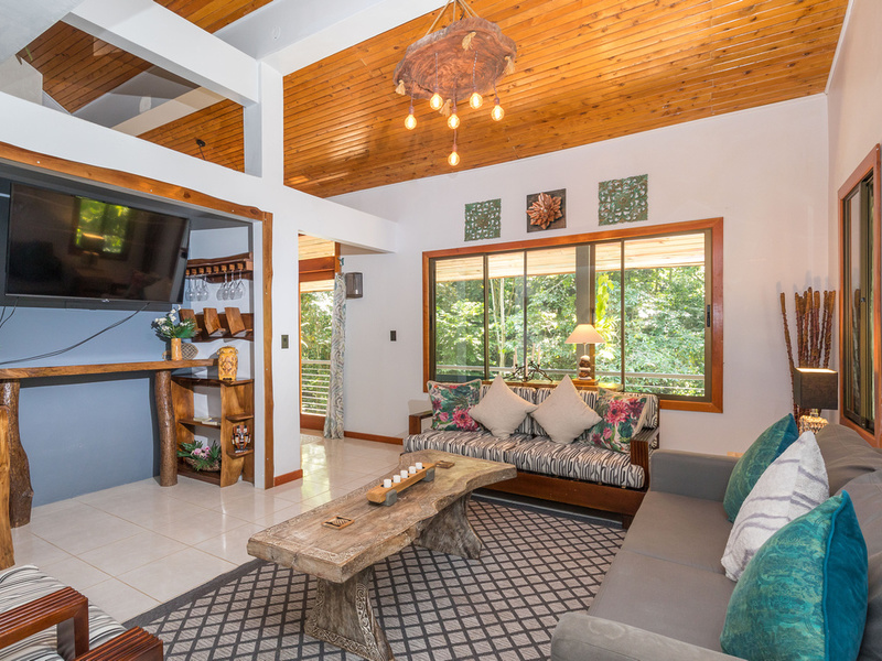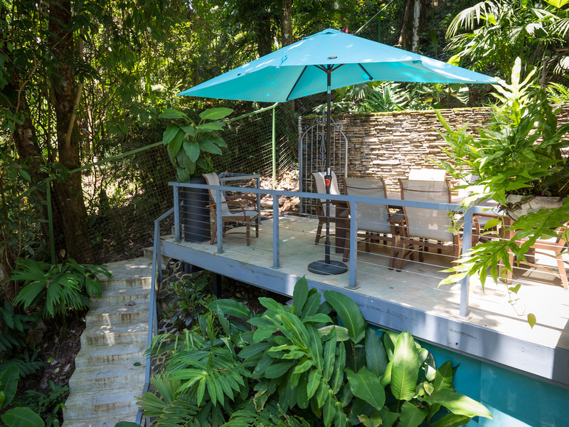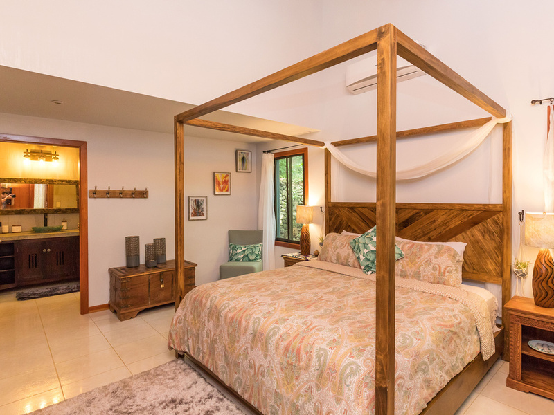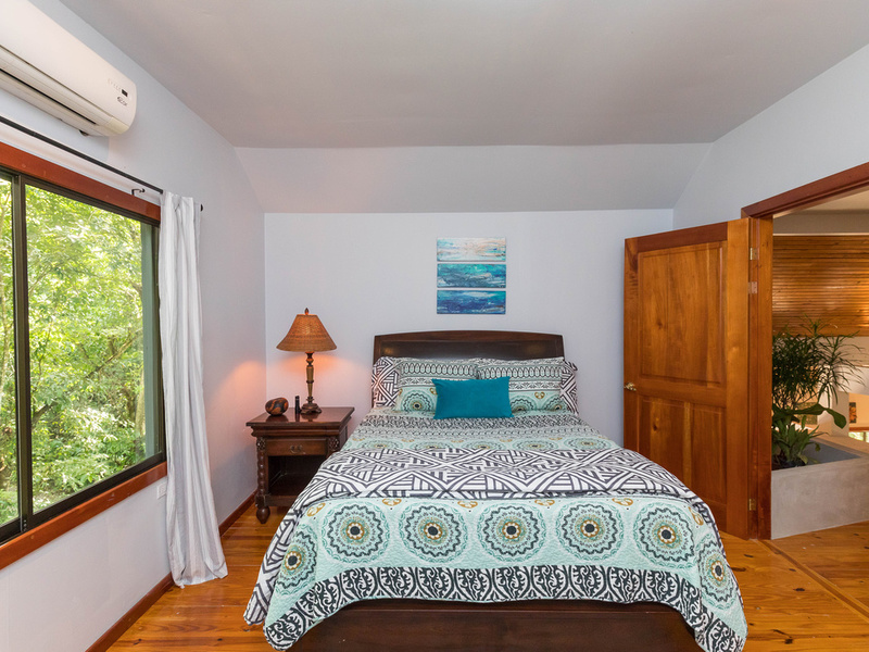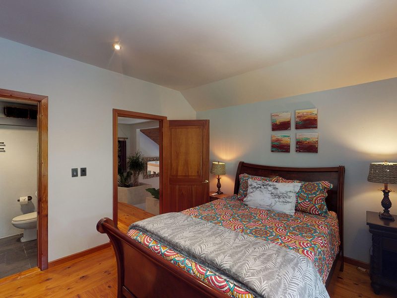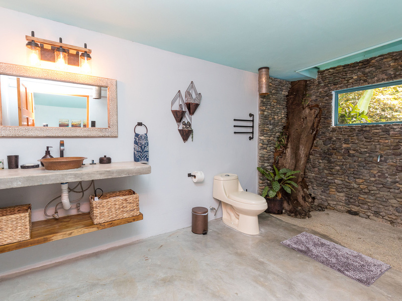A few steps up from the pool takes you to the first floor of the home, a separate apartment with a full balcony running the length overlooking the pool. This apartment has a full kitchen, a living/dining area, and a master bedroom with king bed and large en suite bathroom with gorgeous natural stone shower. From the master bedroom are sliding doors opening onto the balcony with pool view and the jungle beyond.