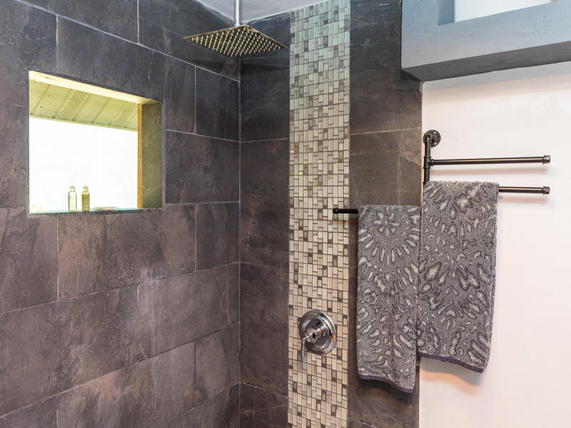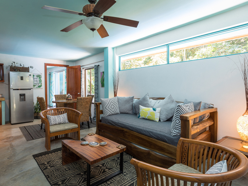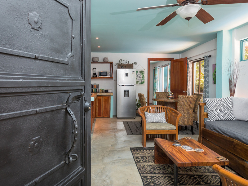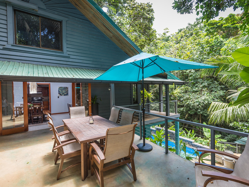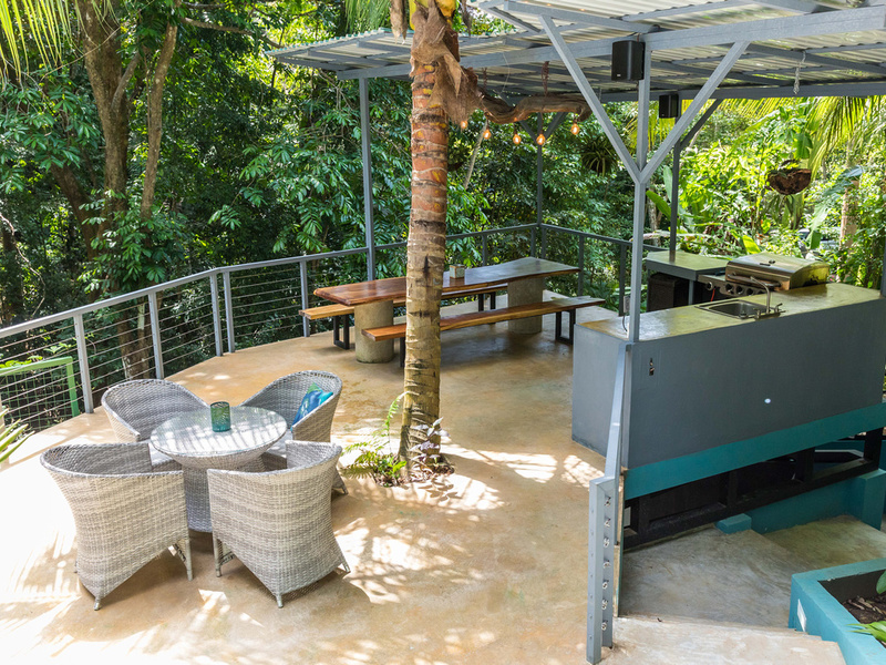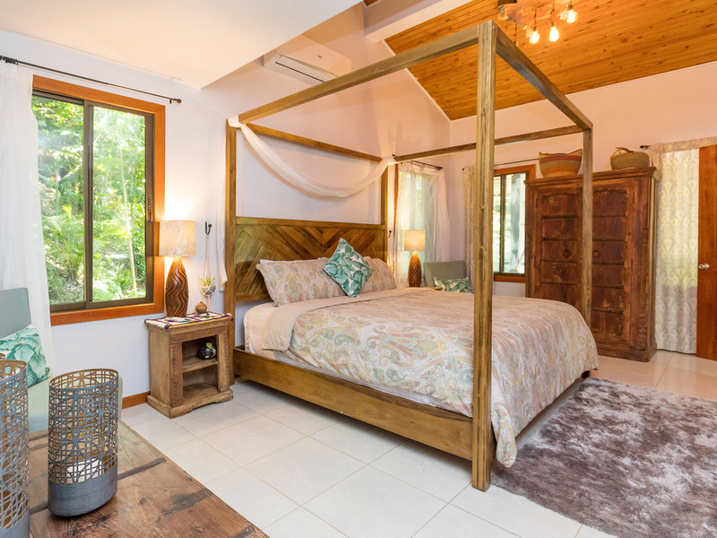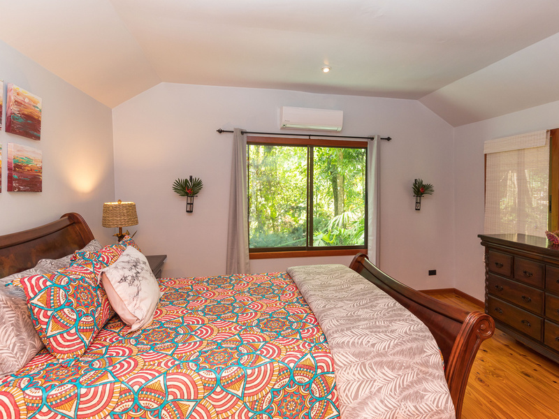 A few steps up from the pool takes you to the first floor of the home, a separate apartment with a full balcony running the length overlooking the pool. This apartment has a full kitchen, a living/dining area, and a master bedroom with king bed and large en suite bathroom with gorgeous natural stone shower. From the master bedroom are sliding doors opening onto the balcony with pool view and the jungle beyond.