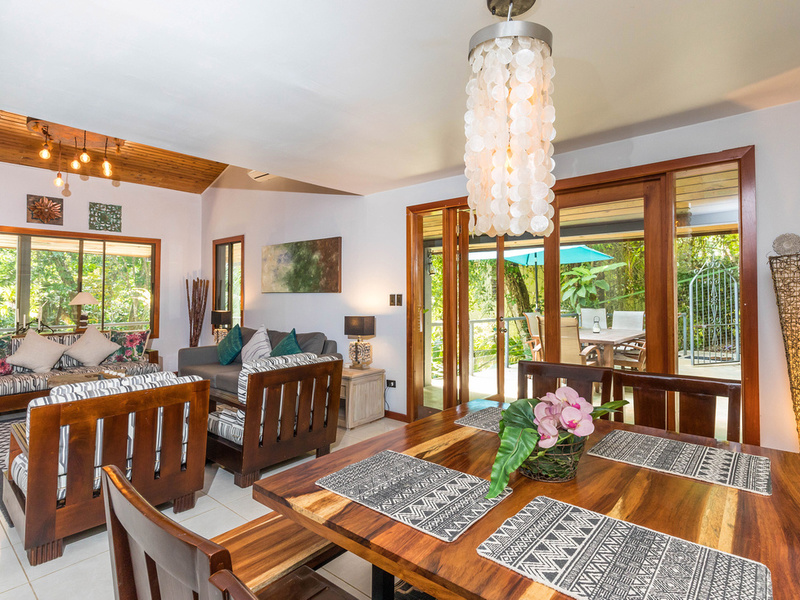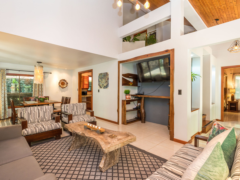Continuing up the sweeping exterior staircase to the second-floor one arrives at a second deck with a full dining table and 6 chairs. The deck wraps around to create another full balcony on the second floor. You enter this apartment into the living/dining area, with the full kitchen just beyond. This 2-floor unit has a center staircase with living on one side, and a master bedroom with king bed and full en suite bathroom on the other side. At the foot of the stairs is a French door opening onto the balcony overlooking the pool and jungle beyond. Up to the stairs, you find two bedrooms with Queen sized beds and full en suite bathrooms.