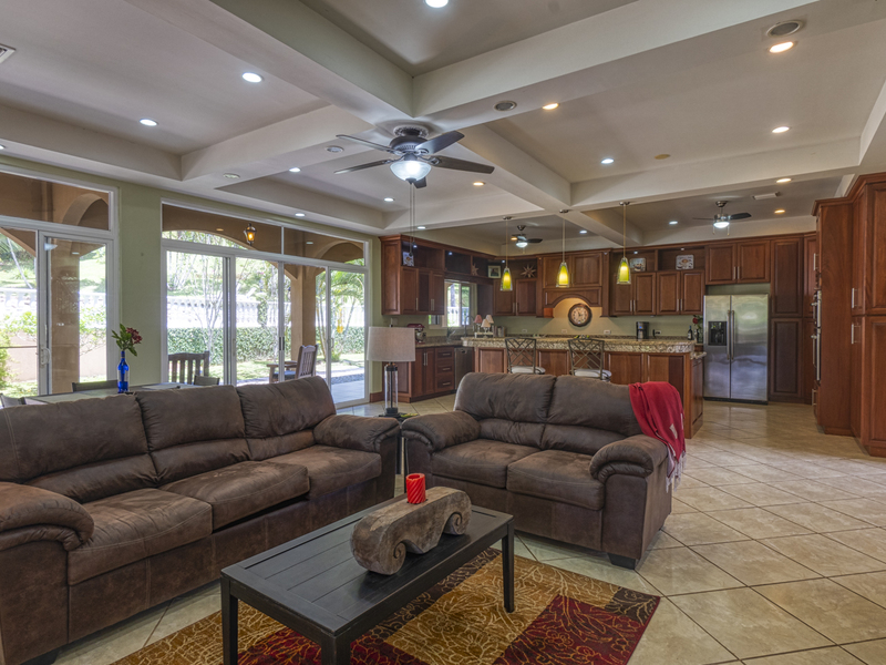 The adjoining family room opens via wall to wall screened sliding doors to a large covered patio, wrap-around porch and cobblestoned paths along the quebrada. Here you can walk through the hacienda-style archway to the 12,000-gallon heated pool with private veranda/cabana. Simply put, this is luxury living at its finest.