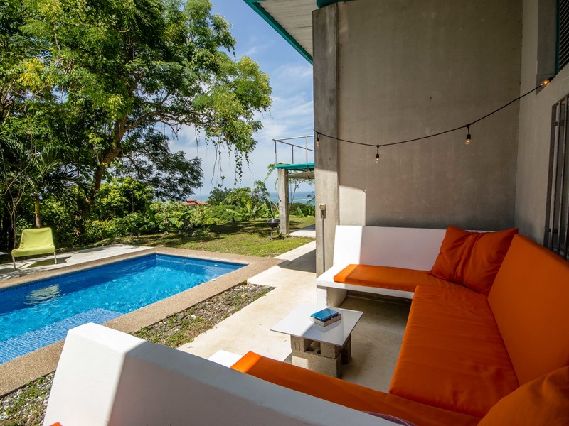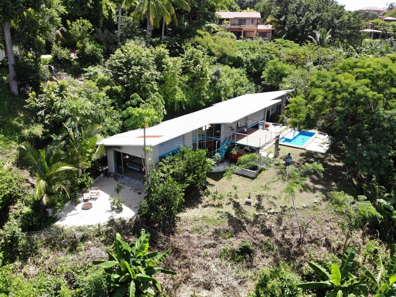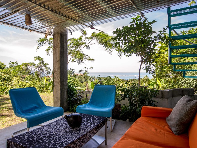 It is a 10-minute walk down a pretty, mostly paved street to the beach. Just a two-minute drive into downtown Sámara, it is situated on a hill at the midpoint of Playa Sámara.