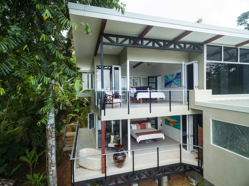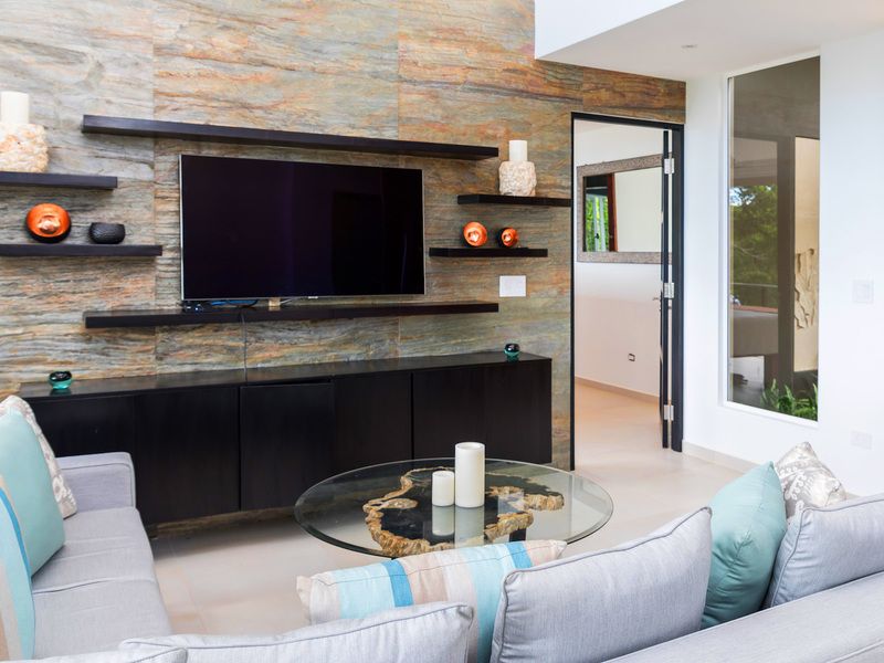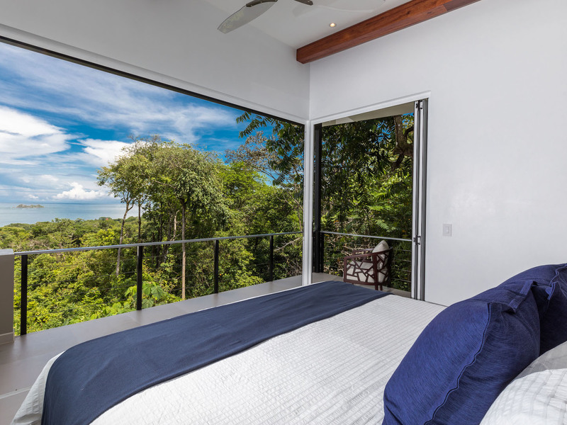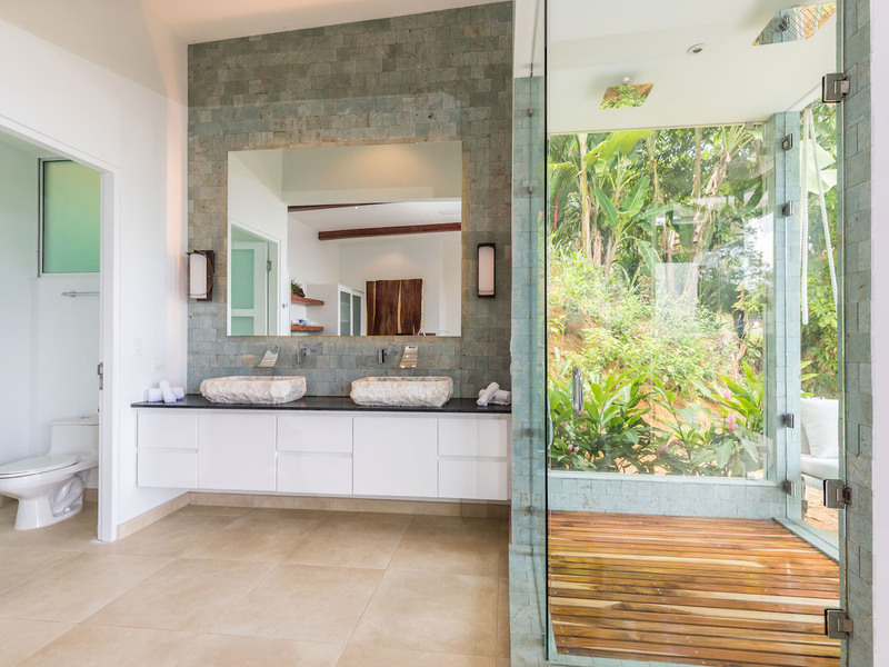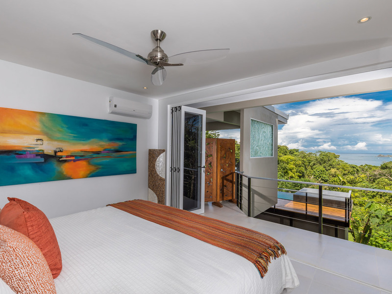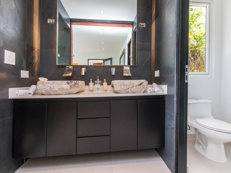 The high-end kitchen and both living rooms meld together with a light, airy design complete with splashes of blue, green, and yellow, making you feel like you’re right at the beach. The high-end kitchen features grey painted walls, custom-made cabinetry, and stainless steel appliances, including a Kitchen Aid gas range. It also features stone countertops and a large wine cooler, ideal for entertaining. The glass bi-fold windows open up to the dining terrace, which creates an indoor/outdoor kitchen feel. The terrace dining room and living room features a hand-crafted wooden table and eight chairs, as well as an additional sink and ice maker, and a Kitchen Aid BBQ. It also features a custom-made sofa with cream Sunbrella fabric, accented with yellow throw pillows. The indoor living room includes a double height ceiling, which is covered in grey slate stone and features built-in shelves, which enclose an HD flat-screen television. It features a sectional cream sofa, made with all weather-proof Sunbrella fabric. All of the furniture is local custom made in Costa Rica. This living room also includes bi-fold opening glass doors that open up to the terrace dining and living room area.