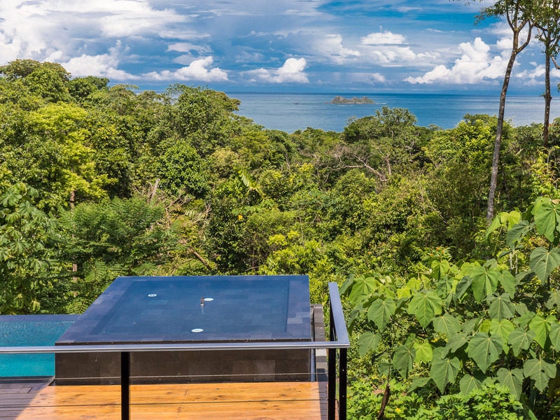 The terrace area leads into a large outdoor area, which features a large wooden deck with a variety of teak lounge chairs, perfect for watching the ocean views and Isla Ballena views. It also includes an infinity lap pool with a waterfall, ideal for swimming laps or merely staying cool. A Jacuzzi hot tub is attached to the infinity pool. Off among the trees, there is a covered pavilion with a round sofa swing. This setting is ideal for relaxing as a couple or as a family.