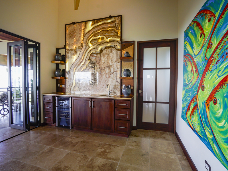 This luxury home features four luxurious bedrooms. The master bedroom is on the first floor and features a king-sized bed and a handcrafted wood headboard. The door wall opens right up to the patio. The master bath features Turkish vein cut travertine tiles on the walls. It also includes double stone vessel sinks and a luxurious Jacuzzi tub. The second master bedroom is located upstairs features its own luxurious bathroom with an amazing balcony looking to the Pacific Ocean. The other two bedrooms are up a flight of wooden stairs. At the top of the stairs, there is a stunning wooden cabinet with another sandstone carving on it. Each of the additional bedrooms also includes hand-crafted wooden furniture, end tables, a reading chair, and an ensuite bathroom. However, these two bathrooms feature an indoor bathroom and an outdoor shower on your private terrace area. You’ll have stunning views of the amazing canopy of trees from the outdoor tiled shower. The large private terrace includes Castelli wicker outdoor furniture, including sofas and chairs.