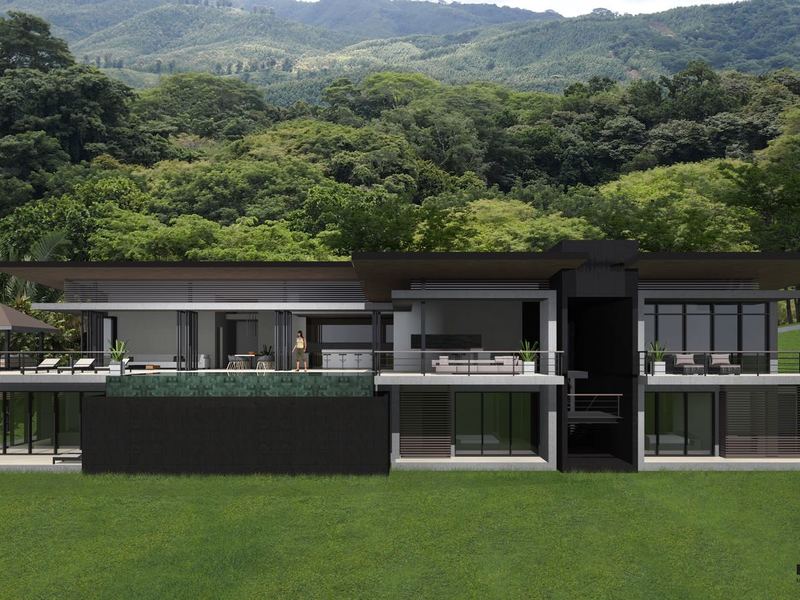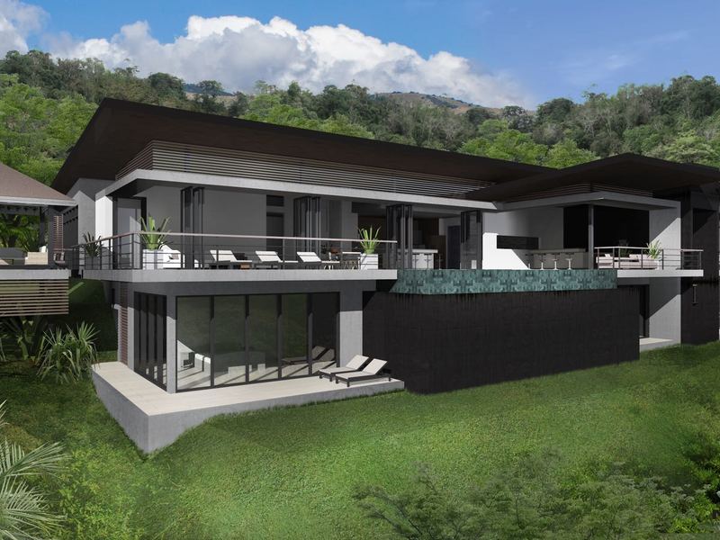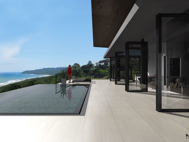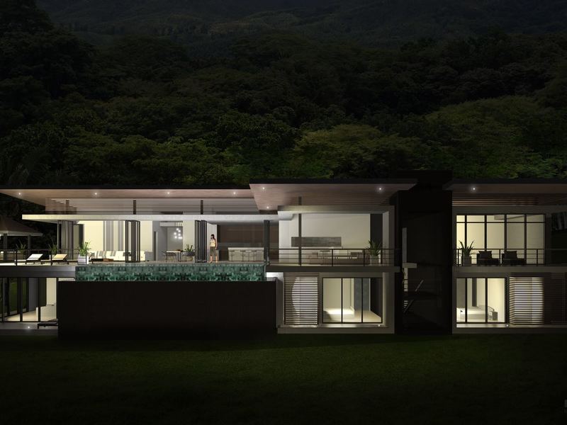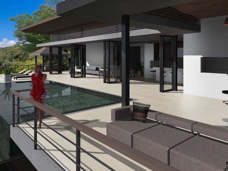 This five-bedroom, six ½ -bath luxury villa will amaze you from the moment you step inside with its’ panoramic views of the Pacific Ocean from every room. The open floor plan of the living area, dining room, and gourmet kitchen leads right to the outdoor area and has scenic views from every angle. The gourmet kitchen features stainless steel appliances, granite counter tops, and an eat-in breakfast bar. Pendant lighting and ceiling fans enhance the look of the room. The dining room features a wooden dining table with seating for eight. The living area features a moon chair, two white couches, and full-length windows with views of both the ocean and the jungle. Glass accordion doors open up to the outdoor entertaining area.