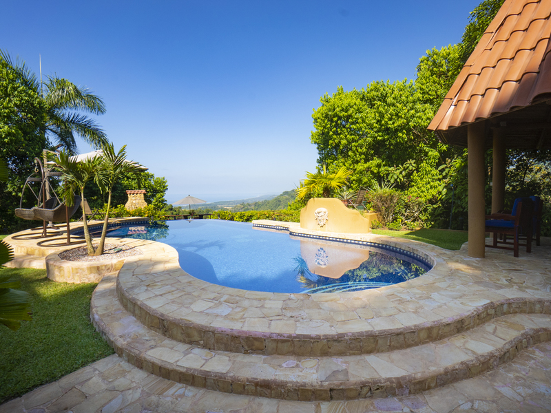 This is a Spanish styled luxury home situated in the mountainous community of Lagunas, which is just minutes from Dominical. The residence is perched high above the jungle valley at an elevation of 900 feet above the sea. The home and its luscious landscaped estate provide security, as well as peace and quiet while providing miles and miles of ocean views and gentle breezes throughout the day.