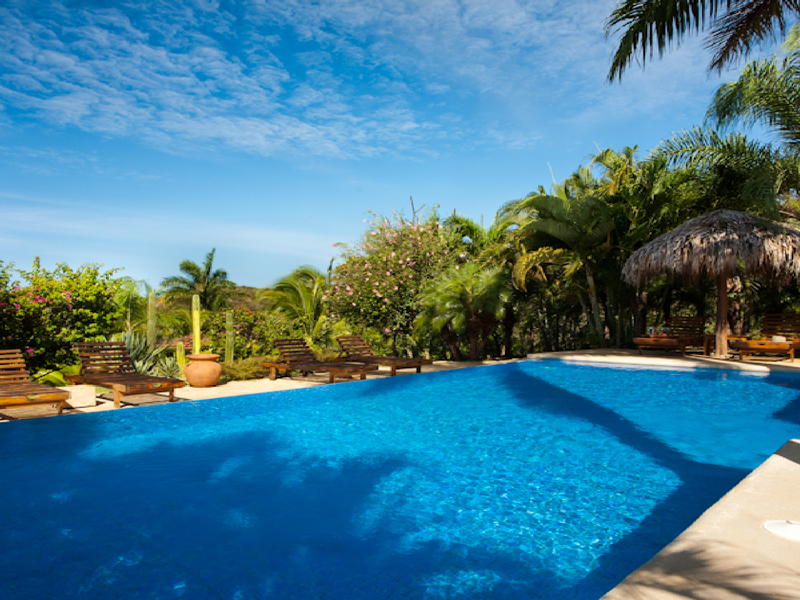 The main residence, a spacious three-bedroom villa designed with Mediterranean charm, is situated above an infinity pool with expansive views of the Pacific coast. Terraces around the open living room and kitchen provide an exceptional place for relaxing while watching sunsets over the ocean.