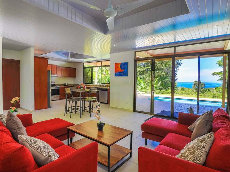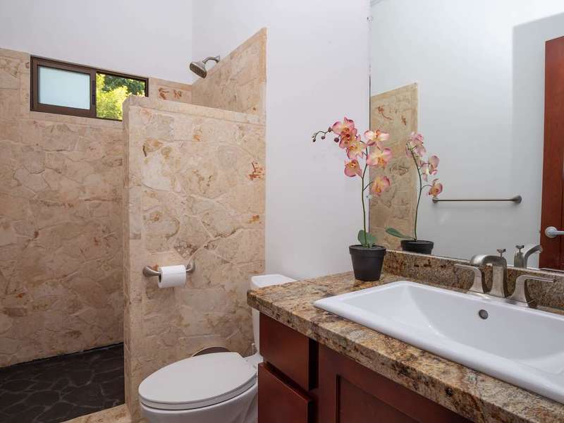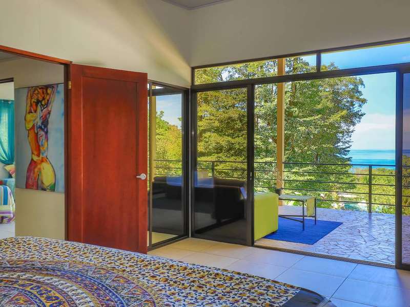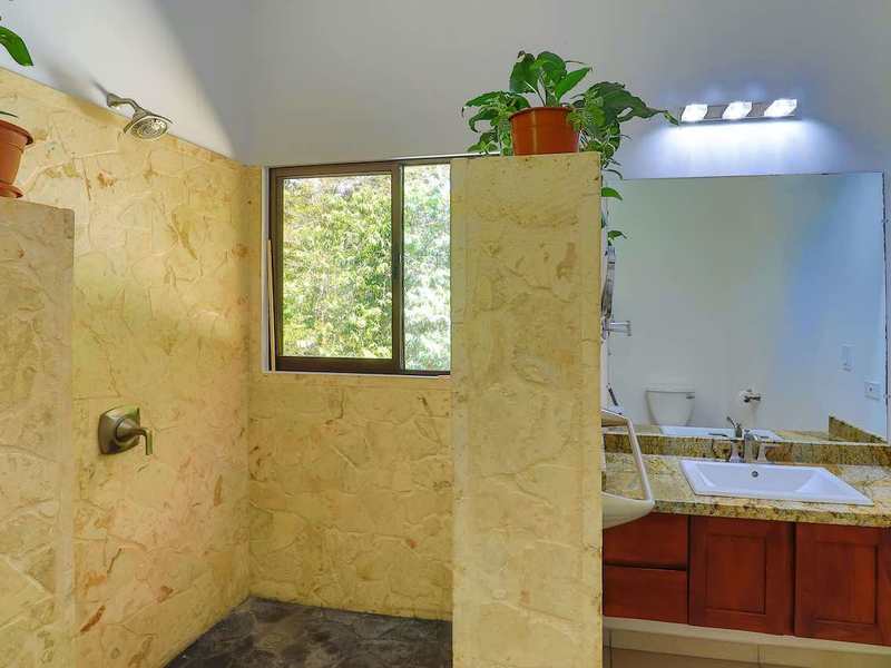 The bedrooms are located upstairs to maximize the ocean and jungle views. The master bedroom is large and home to a king-sized bed, mirrored closets, air conditioning, and LED lighting. The master bathroom offers a large shower and sink finished in coralina stone and rich granite, respectively. Step out through sliding glass doors to the master living area with l-shaped couch and the best view on the property.