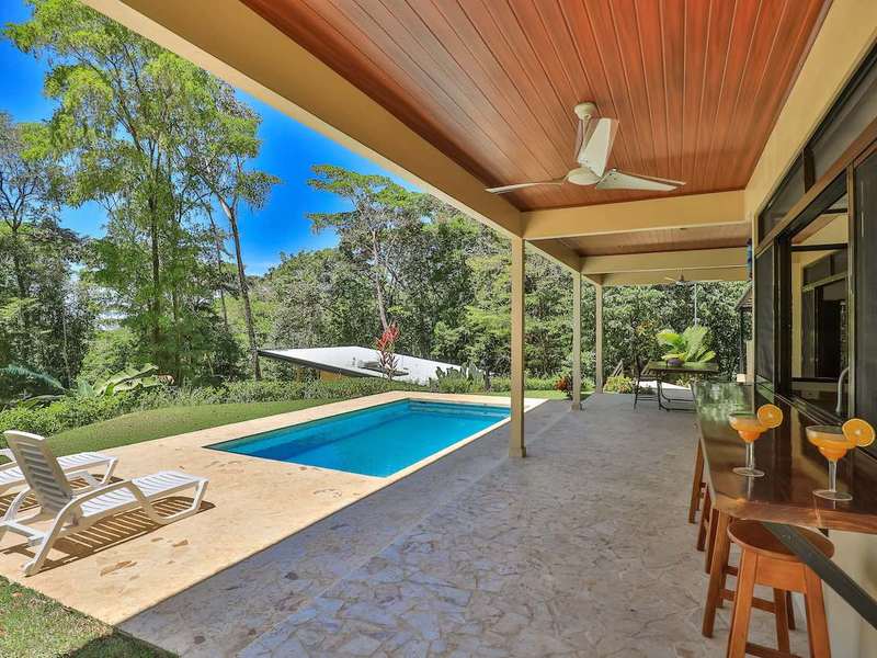 Costa Rica living is all about the outdoors, and this home offers ample outdoor living space highlighted by the large, covered pool patio. Whether socializing at the kitchen bar or the hardwood dining table, it’s the ideal area for relaxing. The crystal blue swimming pool measures 10’x20’ and 5’ deep. It is topped with coralina stone and sunshine, but it does enjoy some morning and afternoon shade.