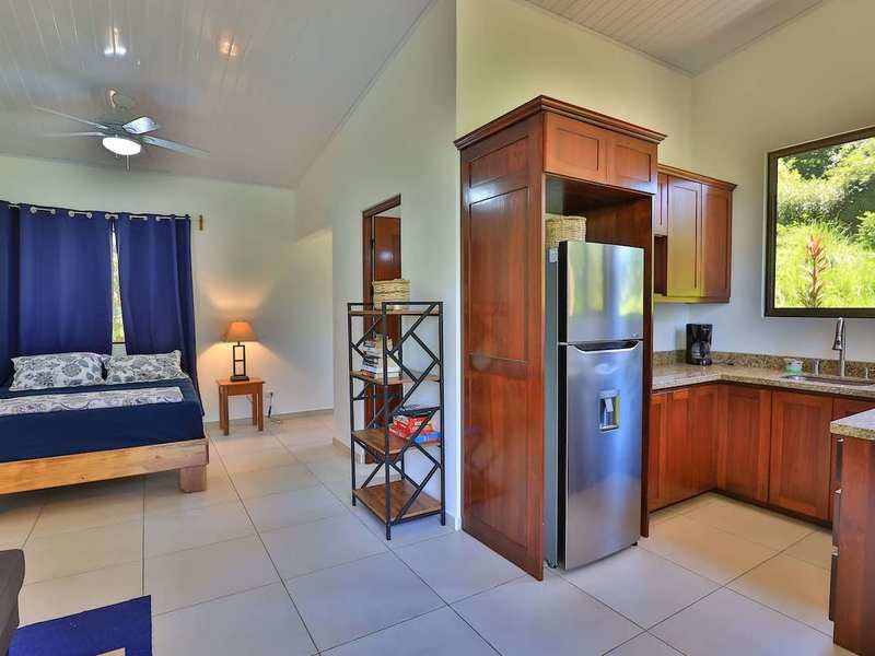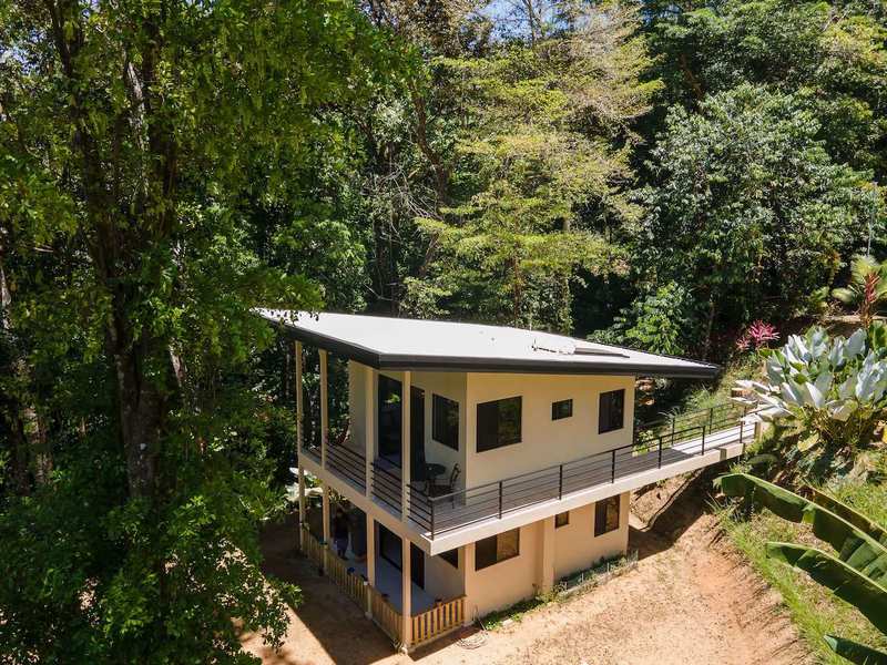 Passing over the engineered footbridge, you come to the two-level guest house. It was built to match the main home in 2019. It has a private split-level design with separate studio suites. The private upper level has all of the amenities your guests will need—large studio bedroom, full bathroom, living area, and kitchen finished in granite, hardwood, and stainless steel appliances—refrigerator, electric cooktop. The balcony offers a private spot to read or relax within the lush jungle. Currently, the caretaker resides in the lower-level suite. A bit smaller in area, it offers a tucked bedroom, full bathroom, living area, and a kitchen. There is a private trail down to a small creek with pleasing cascades that emerge in the rainy season.