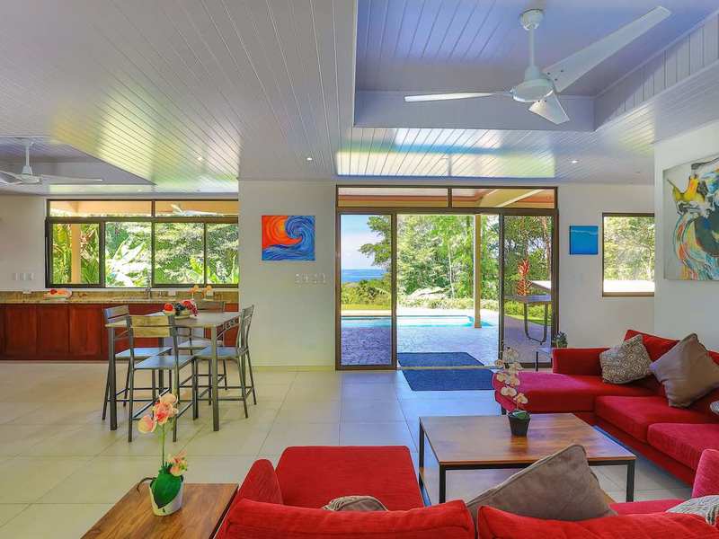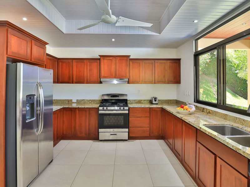 The private gate opens to a driveway that drops down to two dwellings—a custom main house and split-level guest house connected by a coralina stone foot bridge. The main house is a clean, two-story contemporary design completed in 2018. Entering through the front door, you immediately feel the ocean and jungle setting through sliding glass doors and large windows. There is a half bath and laundry room to your left as well as a spacious kitchen wrapped in rich granite and hardwood. There is ample counter and storage space, plus GE stainless steel appliances including-- a gas stove, energy-efficient refrigerator and dishwasher, plus brush metal fixtures, and dual-basin sink. Whether you’re watching the kids in the swimming pool or taking in the ocean view… washing dishes was never so enjoyable. The laundry room, with separate entrance, holds a Whirlpool washer/dryer and extra room for storage. The ceilings reach 10’ on the lower level and is vaulted on the upper level giving the house an open, spacious feel.