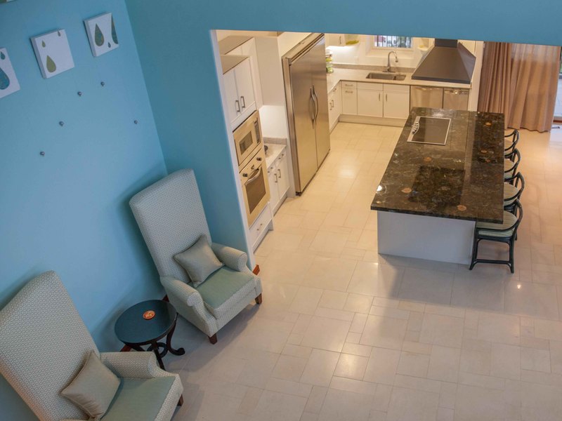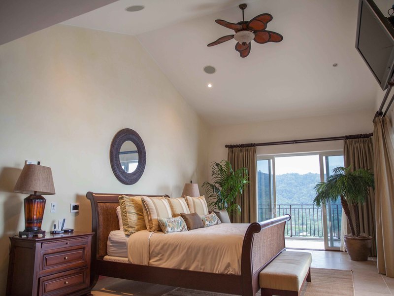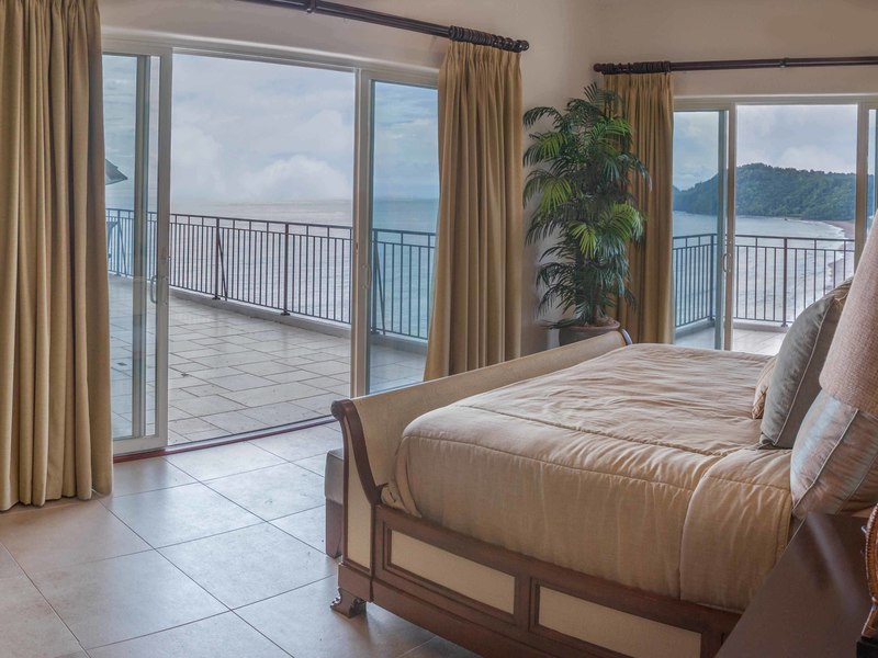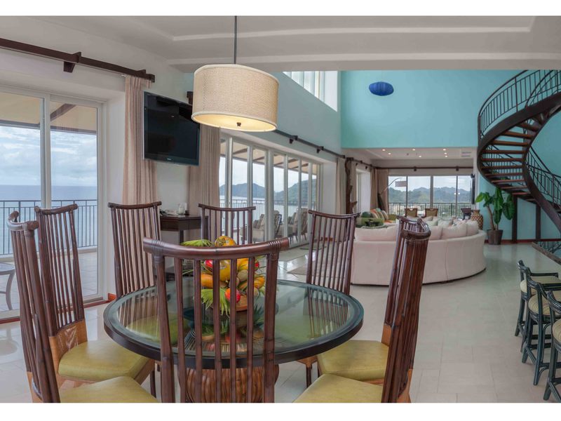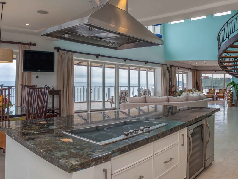 Upon entrance you're greeted with an alluring view composed of the spiral staircase, the expansive living room and two-story high windows gazing upon the Pacific Ocean. There's a welcoming feeling of openness stretching from the high end kitchen all the way to the media room. You can access the wrap-around terrace from any point on the first floor, which lets you admire the entirety of the beach, from north to south, the mountains and most of Jacó, you can even see the rain coming from the ocean a mile away, with a view of about 230°. It's hard to choose which is more breathtaking: the sunrise or the sunset.