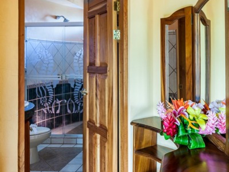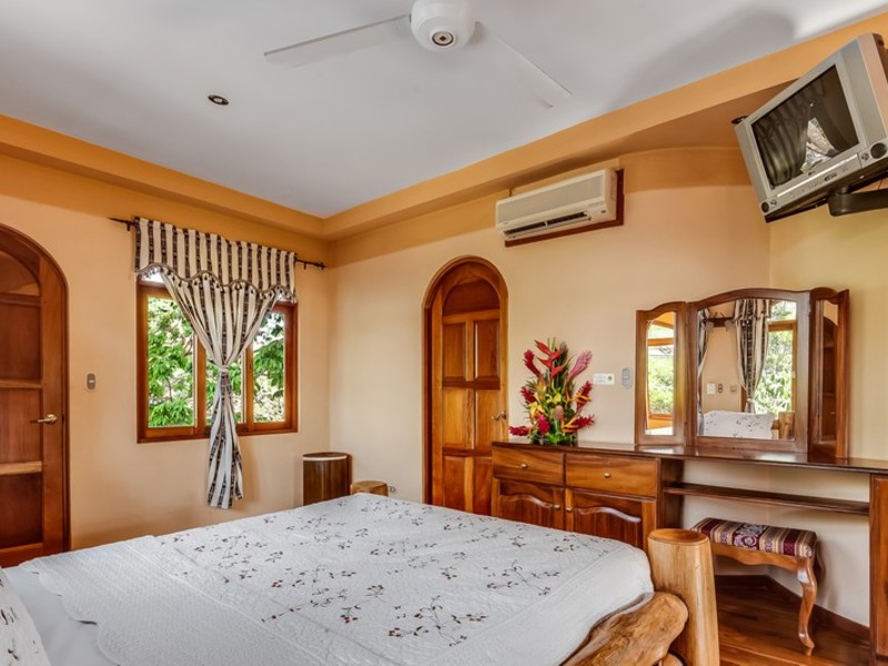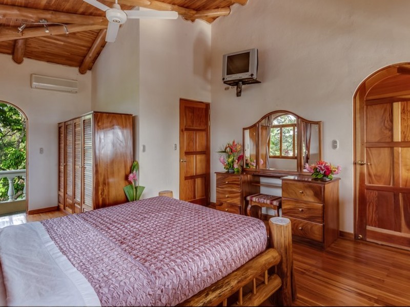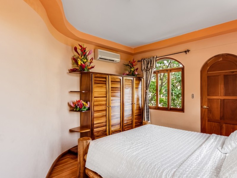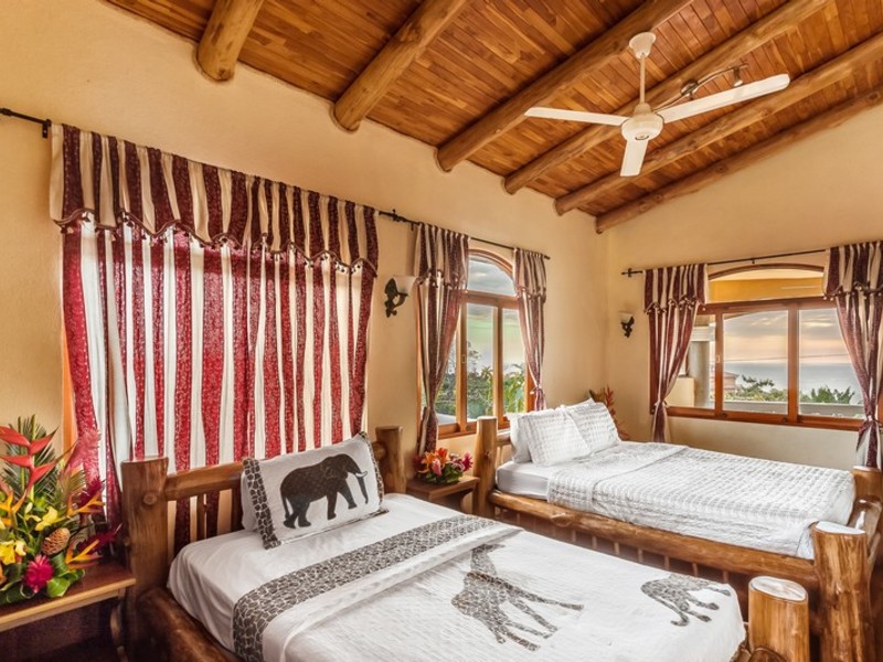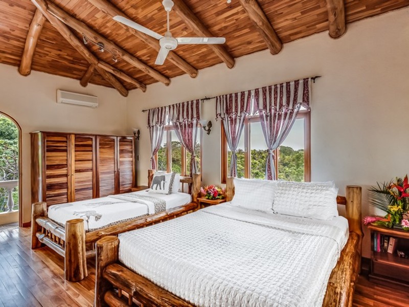 On the second level of this Manuel Antonio villa there are two more bedrooms, each equipped with queen beds and private bathrooms. The second level also has and fully-equipped kitchen, a dining area and garden.