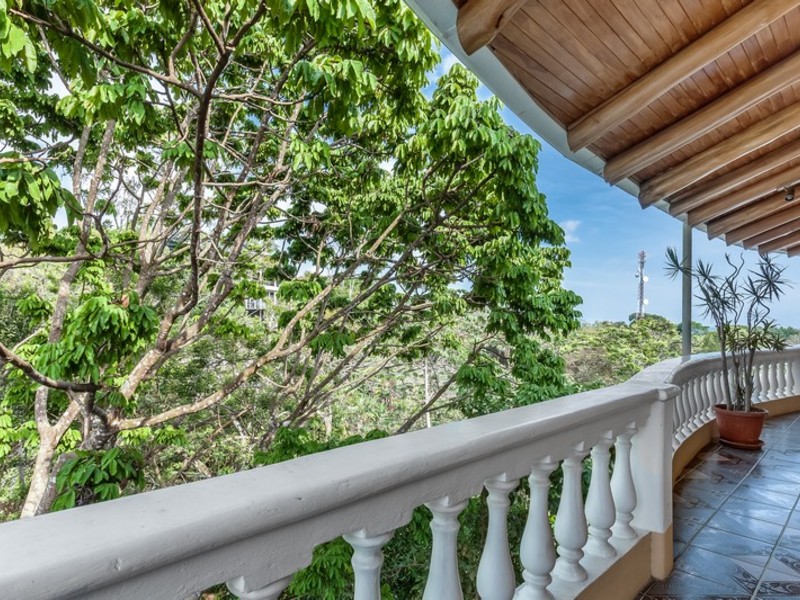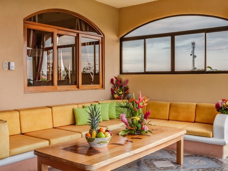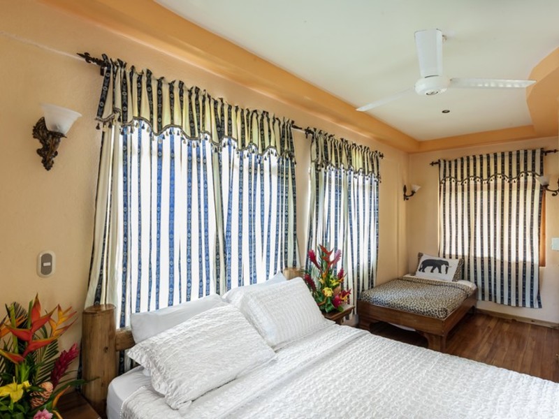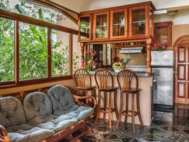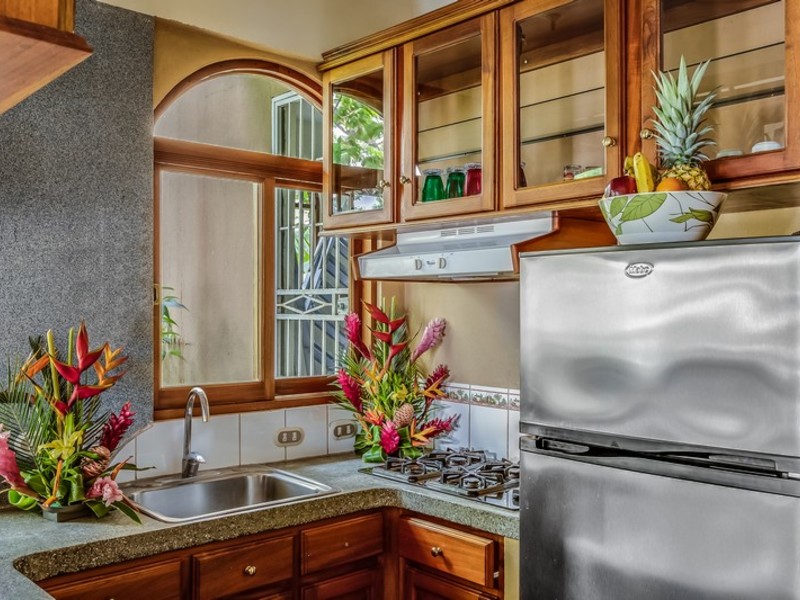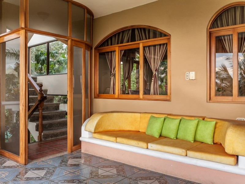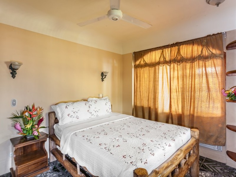 On the second level of this Manuel Antonio villa there are two more bedrooms, each equipped with queen beds and private bathrooms. The second level also has and fully-equipped kitchen, a dining area and garden.